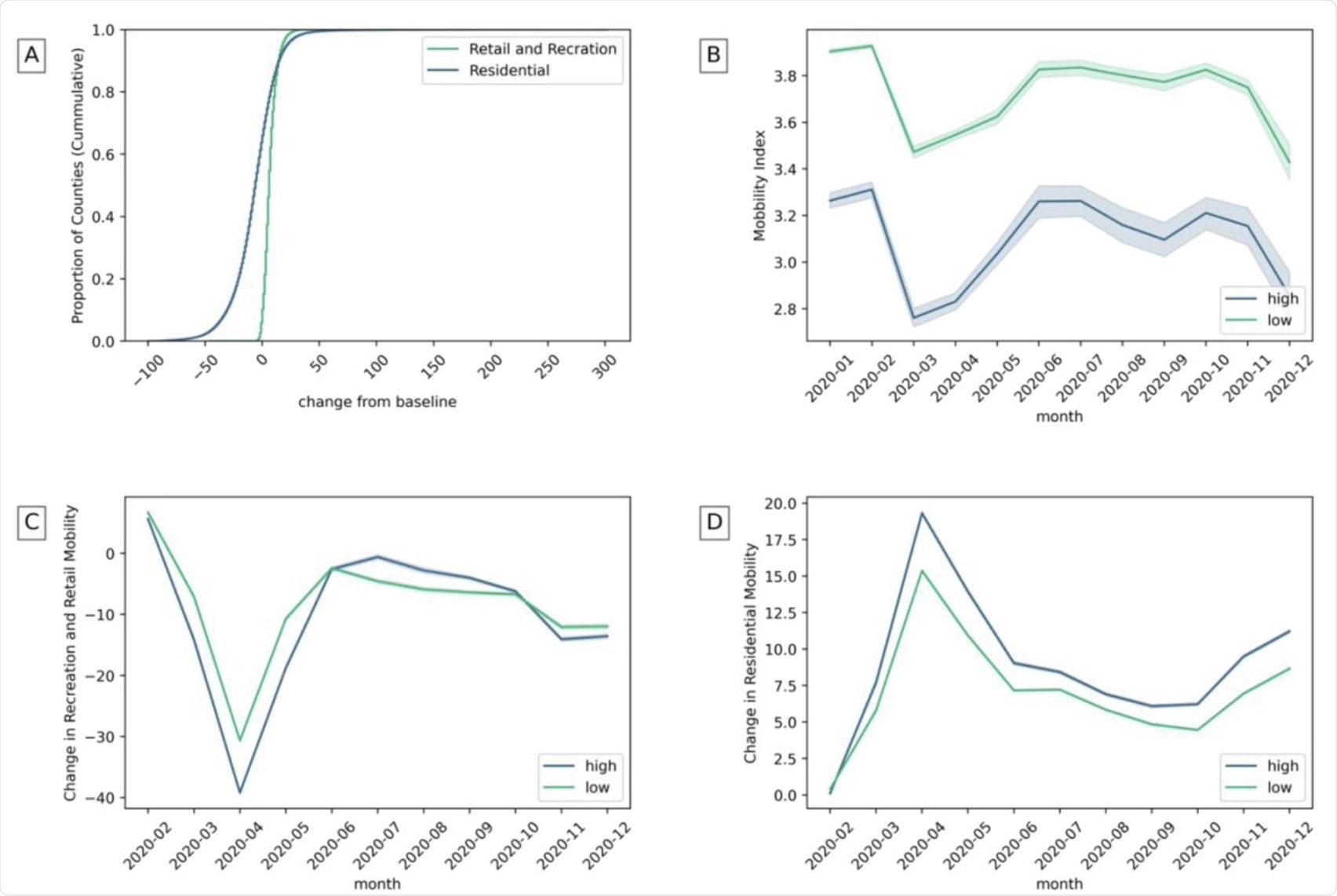 A) The change of recreation and residential mobility in counties. B) Mobility index in counties with high and low community health. C) Recreation and retail mobility in counties with high and low institutional health. D) Residential mobility with high and low family unity. (The highest and lowest 25% of counties are considered).