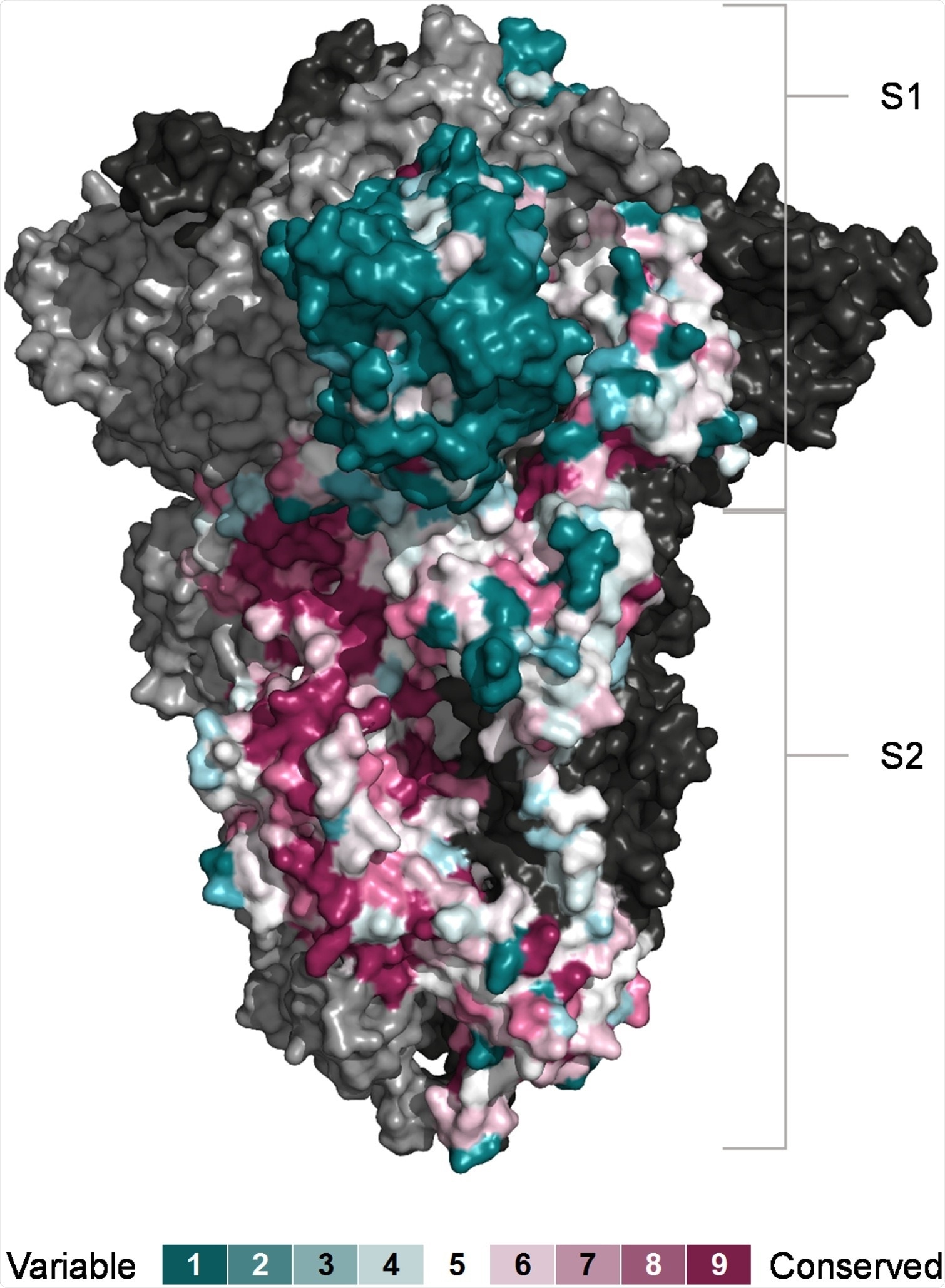 Conservation of SARS-CoV-2 S subunits. Sequence conservation visualised on the closed structure of SARS-CoV-2 spike (PDB ID 6ZGE) [119]. Chain A was coloured according conservation calculated with the ConSurf algorithm (https://consurf.tau.ac.il) from the sequences of 24 animal and human coronaviruses. The other two chains are depicted in ling and dark grey respectively.