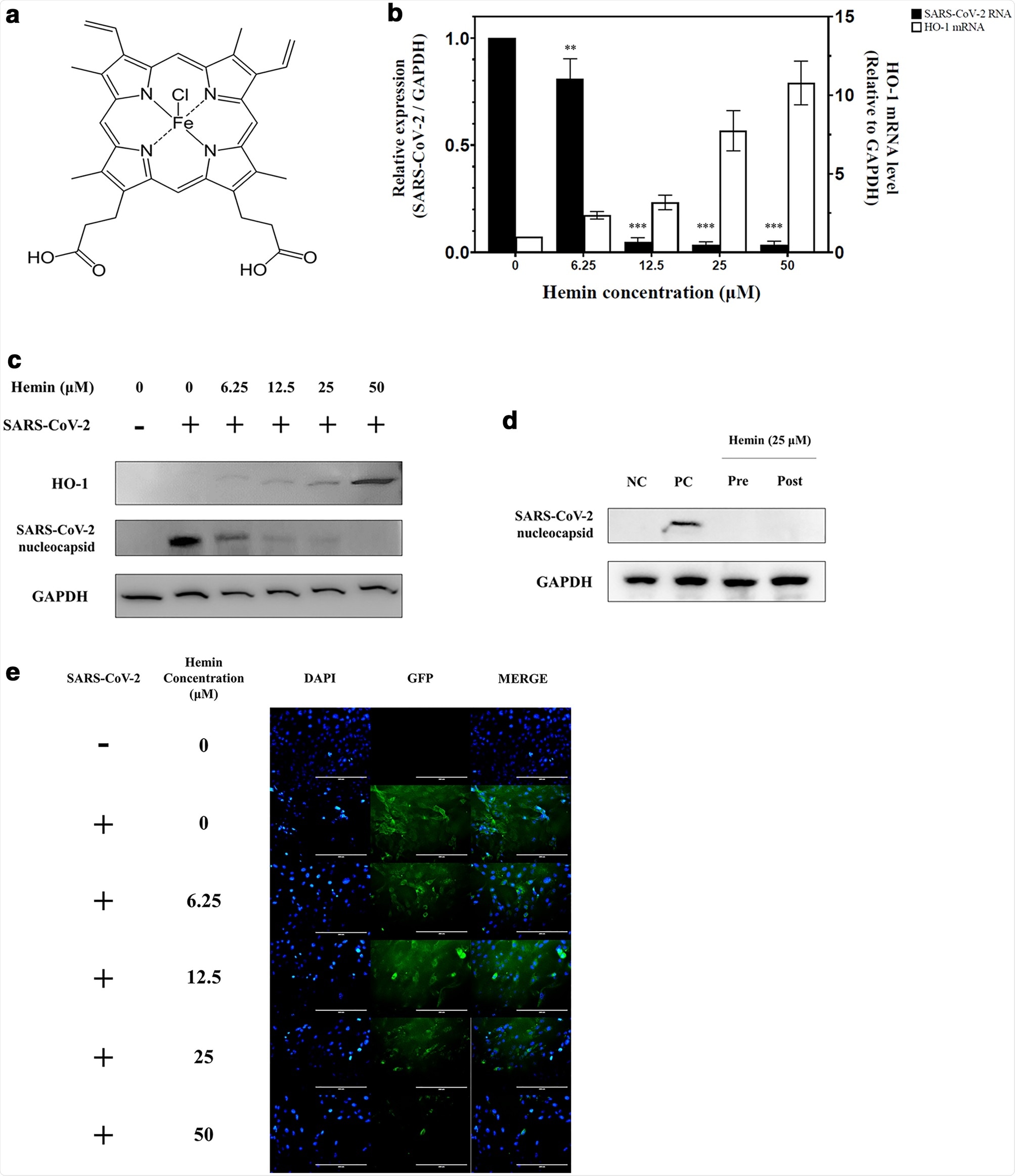 Hemin may prove to be a safe and effective antiviral drug therapy for SARS-CoV-2 infection. The findings from this study may pave the way for developing effective therapeutics that can combat COVID-19.