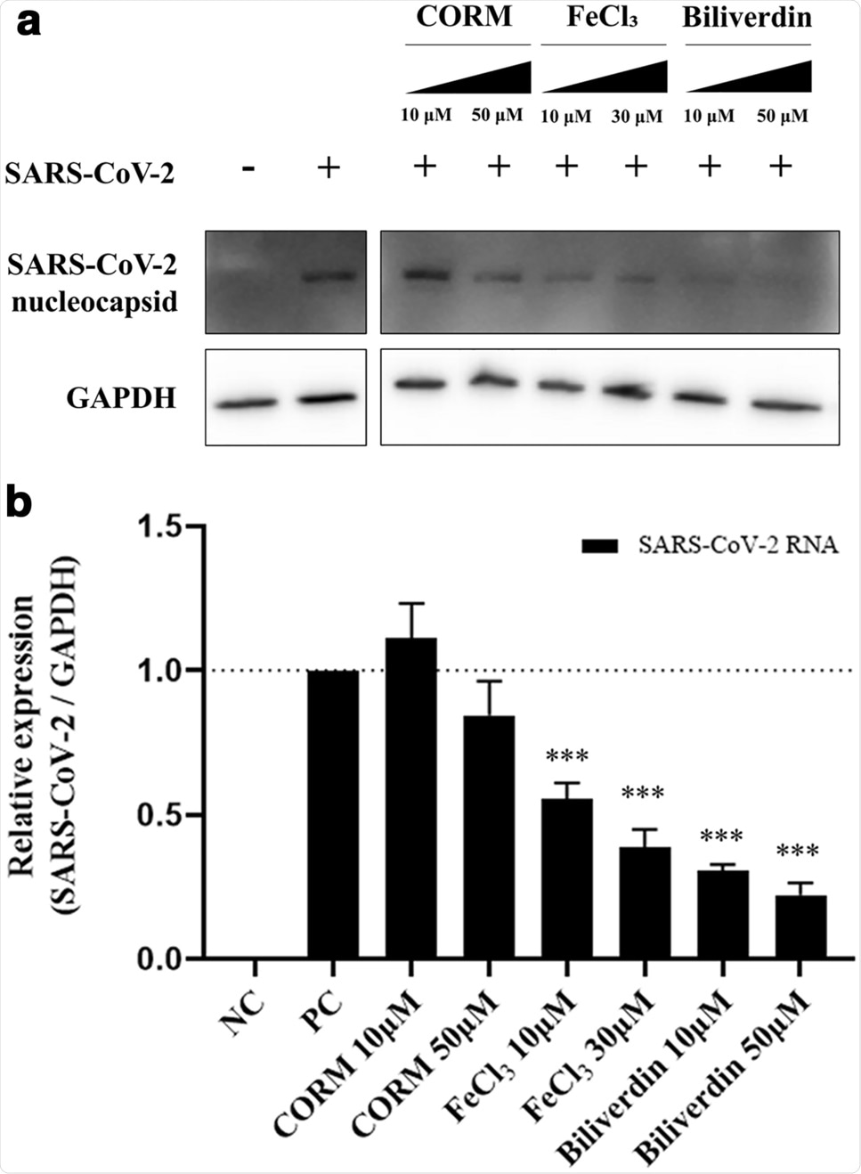 Antiviral efficacy of the metabolites produced by HO-1. The inhibition of SARS-CoV-2 proliferation by carbon monoxide, iron ions, and biliverdin produced by HO-1 was confirmed. Treatment with CORM (releases carbon monoxide), FeCl3, and biliverdin was performed 1 h before SARS-CoV-2 infection. At 24 h post-infection, (a) western blot assay (also see Supplementary Fig. S4d) and (b) qPCR were performed to compare the changes in the viral protein and RNA contents. ***P < 0.001.