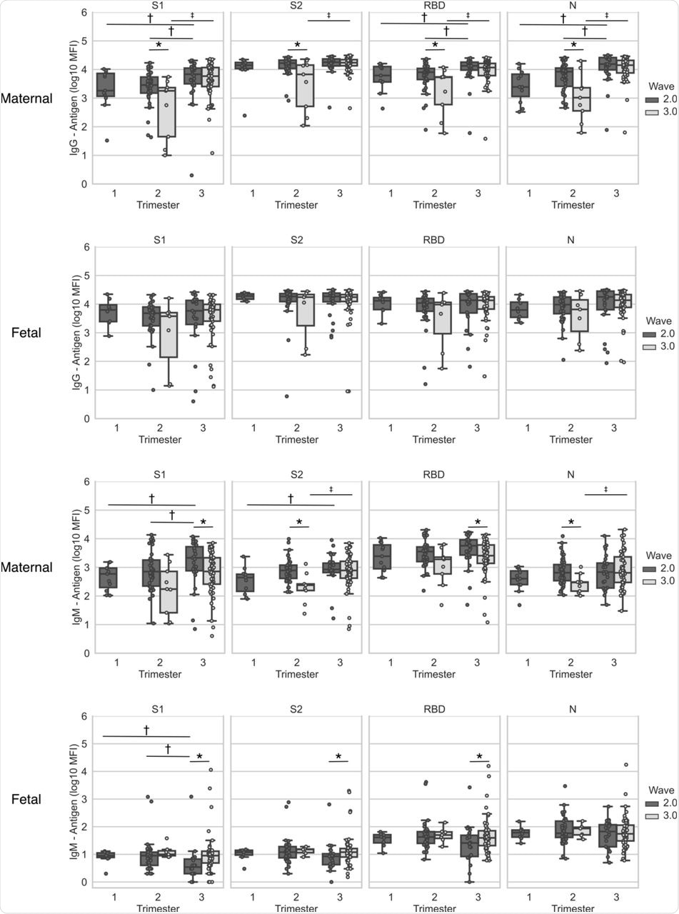 Maternal and cord blood was derived at the time of delivery from patients who recovered from infection during pregnancy with SARS-CoV-2 verified by RT-PCR (n=161). Maternal and fetal IgG and IgM antigens (S1, S2, RBD and N) concentrations are plotted per wave and per trimester of infection. Top two rows, IgG; bottom two rows, IgM. Statistical significance: * indicate significant differences between waves of infection within the same trimester (Wilcoxon Rank Sum Test), † indicate differences between trimesters in the 2nd wave (Kruskall–Wallis one-way ANOVA), and ‡ indicates differences between trimesters in the 3rd wave (Wilcoxon Rank Sum Test). Box and whiskers: Middle line = Median; Box= 25th and 75th percentiles; whiskers= are the minimum (Q1 – 1.5*IQR) and maximum (Q3 + 1.5*IQR).