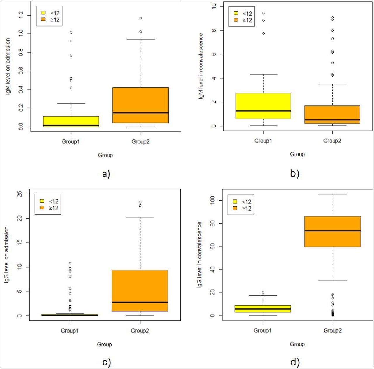 Dots represent IgM/IgG level in children aged <12 years (group1) and those aged≥ 12years (group2). Box plots indicate the median and interquartile range (IQR) and the whiskers represent the maximum and minimum values. The results showed lower COVID antibody IgM and IgG level on admission, and IgG level in convalescence [0.13(0.00,0.09) vs. 0.12(0.03,0.41), p<0.05; 0.02(0.00,0.14) vs. 1.94(0.54,6.40), p <0.05; 5.46(2.41,9.26) vs. 73.63(54.63,86.55), p< 0.05, respectively], but higher antibody IgM level in convalescence [1.05(0.51,2.31) vs. 0.51(0.20,1.69), p=0.016].