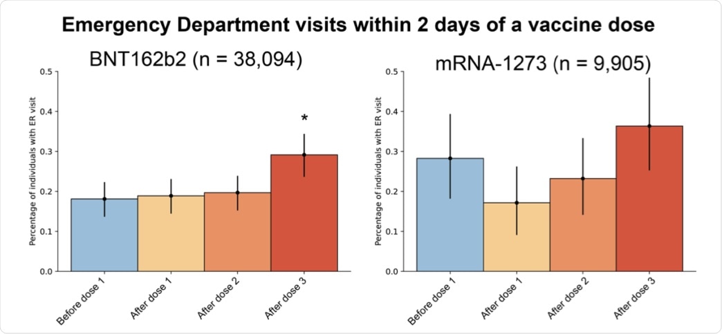 Upon assessing the rate of emergency department visits, there was only a slight increase within two days after the third BNT162b2 dose, which amounted to 0.29% of vaccine recipients, when compared to after the second dose that reported a rate of 0.2%. Meanwhile, no significant difference in emergency department visits was recorded among mRNA-1273 vaccine recipients.