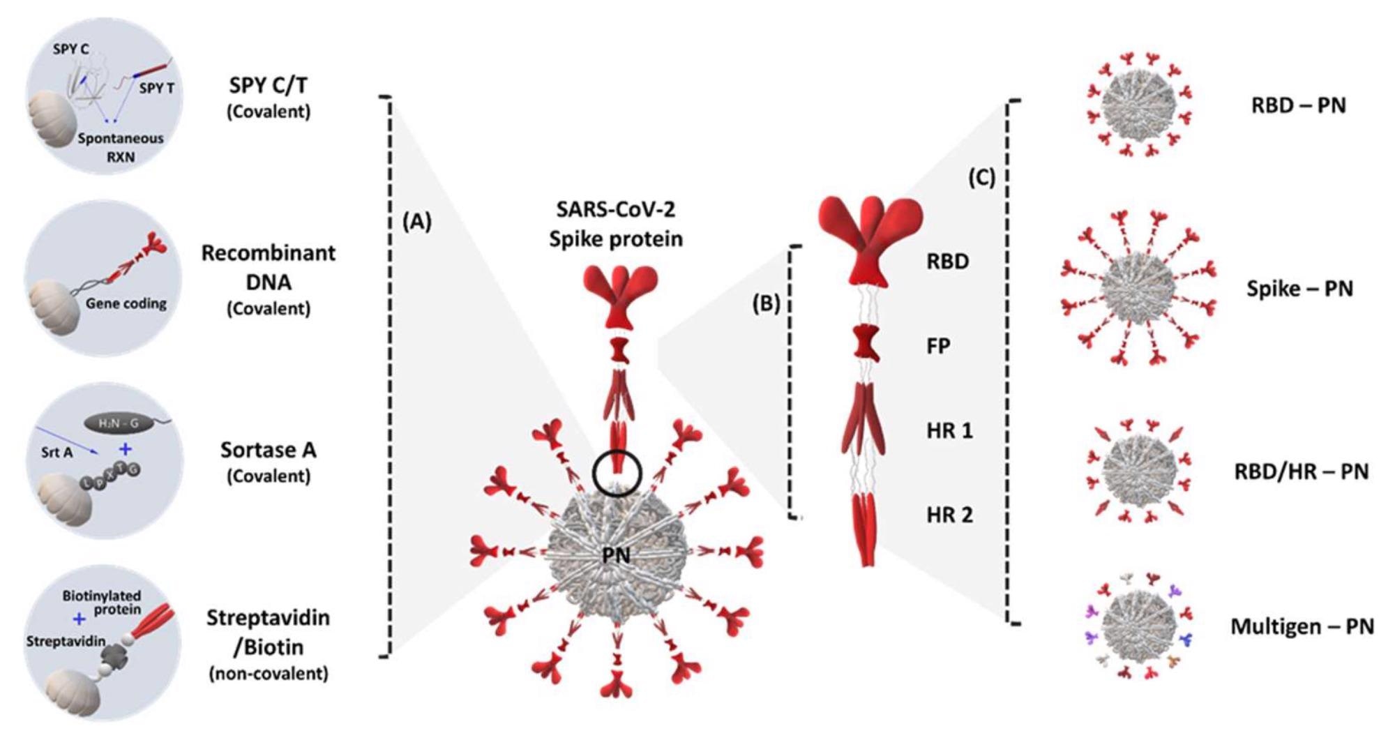 Application of protein nanoparticles (PN) that elicit severe acute respiratory syndrome coronavirus-2 (SARS-CoV-2)- and SARS variant-specific immune response: (A) methods for ligating PN components, nanoparticles, and immunogens based on covalent (SpyCatcher/SpyTag, recombinant DNA, and sortase-mediated bonding) and non-covalent (streptavidin/biotin) interactions; (B) schematic structure of the SARS-CoV-2 spike (S) protein; (C) type of immunogen applications for displaying PNs from the partial epitope region of SARS-CoV-2 to other types of receptor-binding domains (RBDs) and S proteins; SPY C/T, SpyCatcher/SpyTag; HR, heptad repeat.