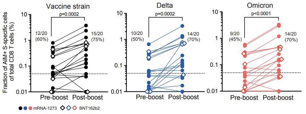 Before booster vaccination, the AIM-induced CD8 T cells specific to the SAR-CoV-2 S proteins of the vaccine strain, Delta variant, and Omicron variant were detected in 60%, 50%, and 45% of the population, respectively. After the booster dose, the proportion increased to 75% in vaccine strain, and both Omicron and Delta variants had about 70%. Before booster dose, the median frequency of SAR-CoV-2 S protein-specific CD8 T cell response was 83% in Delta and Omicron variants and about 79% in the vaccine strain. After the third vaccine dose, the frequency of Delta (89.3%)- and Omicron (71%) variant-specific CD8 T cell response was lower compared to the frequency of vaccine strain.
