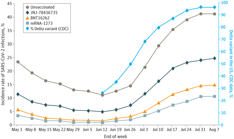 The incidence rate was observed to be 24.8% for unvaccinated individuals, 15.6% for those receiving the JNJ-78436735 vaccine, 8.6% for the BNT162b2 vaccine, and 6% for the mRNA1273 vaccine. The magnitude of SARS-CoV-2 infection was observed to be even higher for unvaccinated individuals during the prevalence of the Delta strain.