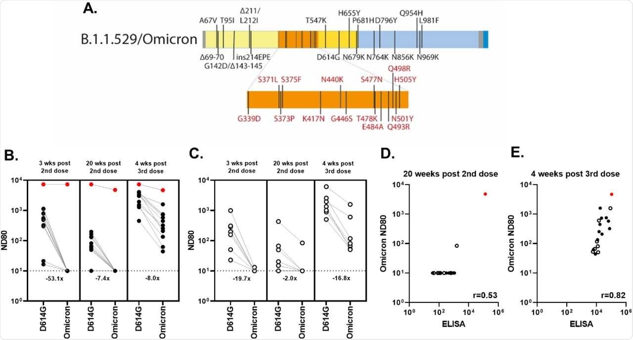 Comparatively, 92% and 86% of subjects showed no detectable nAbs at 20 weeks post the second dose, respectively. The samples collected at four weeks post booster vaccine dose showed significant detectable titers against the SARS-CoV-2 Omicron variant. The correlation of S ELISA and Omicron nAb titer showed improved neutralization titers after the third dose of vaccination.