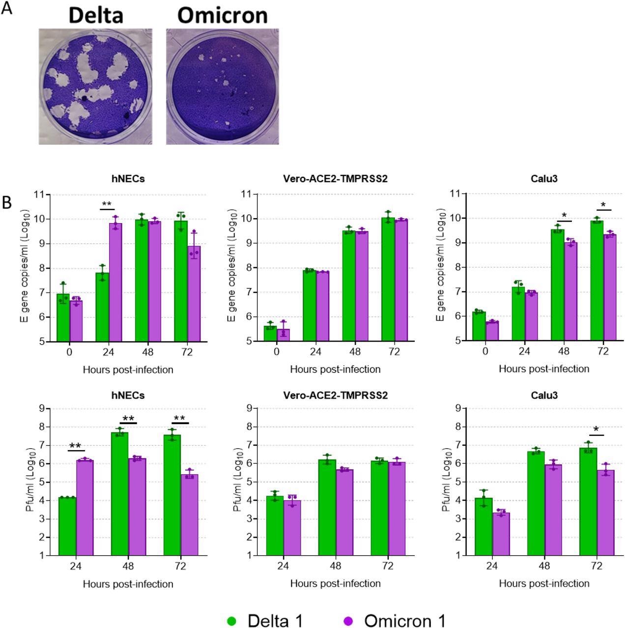 The authors noted that both the Delta and Omicron variants produced plaques in Vero-AT cells; however, the plaques formed by the Omicron variant were smaller and less distinct. In a mixed competition assay involving equal inoculates of both Delta and Omicron variants, the authors found that the Omicron variant outcompeted the Delta variant in hNECs, while in Vero-AT cells, both variants showed similar growth. However, in Calu-3 cells, the Delta variant outcompeted the Omicron variant and remained dominant.