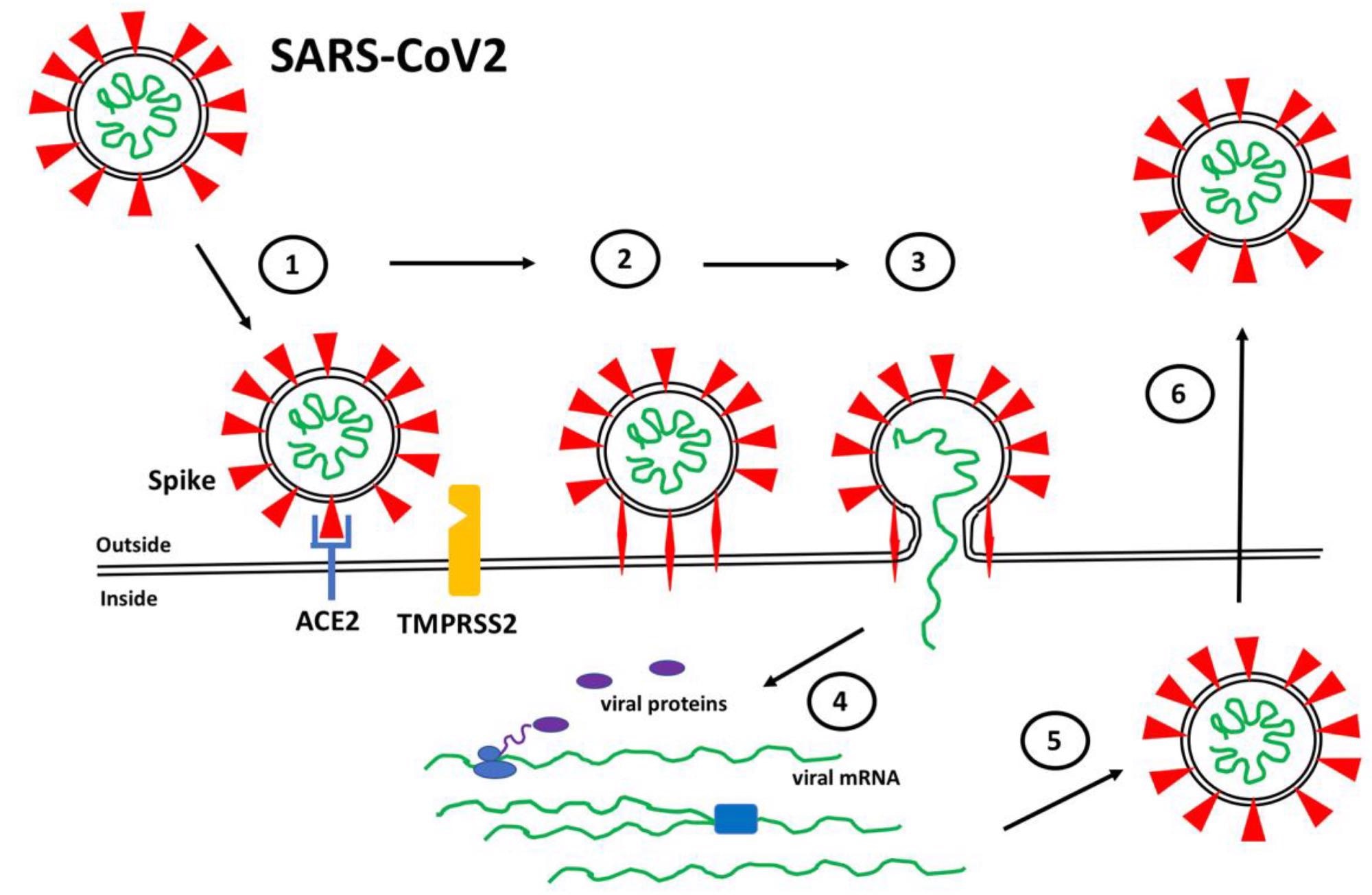SARS-CoV2 Infection. (1) Spike proteins (red) on the SARS-CoV2 surface bind to ACE2 (blue) on the surface of target host cells. (2) Spike-ACE2 interactions position Spike for proteolytic processing on the cell surface by TMPRSS2 (orange) (or by cathepsin in endosomes after internalization). Cleavage of Spike releases a structural constraint that allows Spike to convert to its “fusion” structure that penetrates the host cell membrane. (3) “Fusion” Spike facilitates fusion between the viral and host membranes, allowing entry of viral RNA. (4) Viral RNA is translated and replicated within the host cell. (5) New virus particles are packaged in the host cell where furin cleaves Spike so as to prime it for later conversion to the “fusion” structure. (6) New SARS-CoV2 particles are released (or transferred to adjacent fused cells) to propagate further host cell infection.