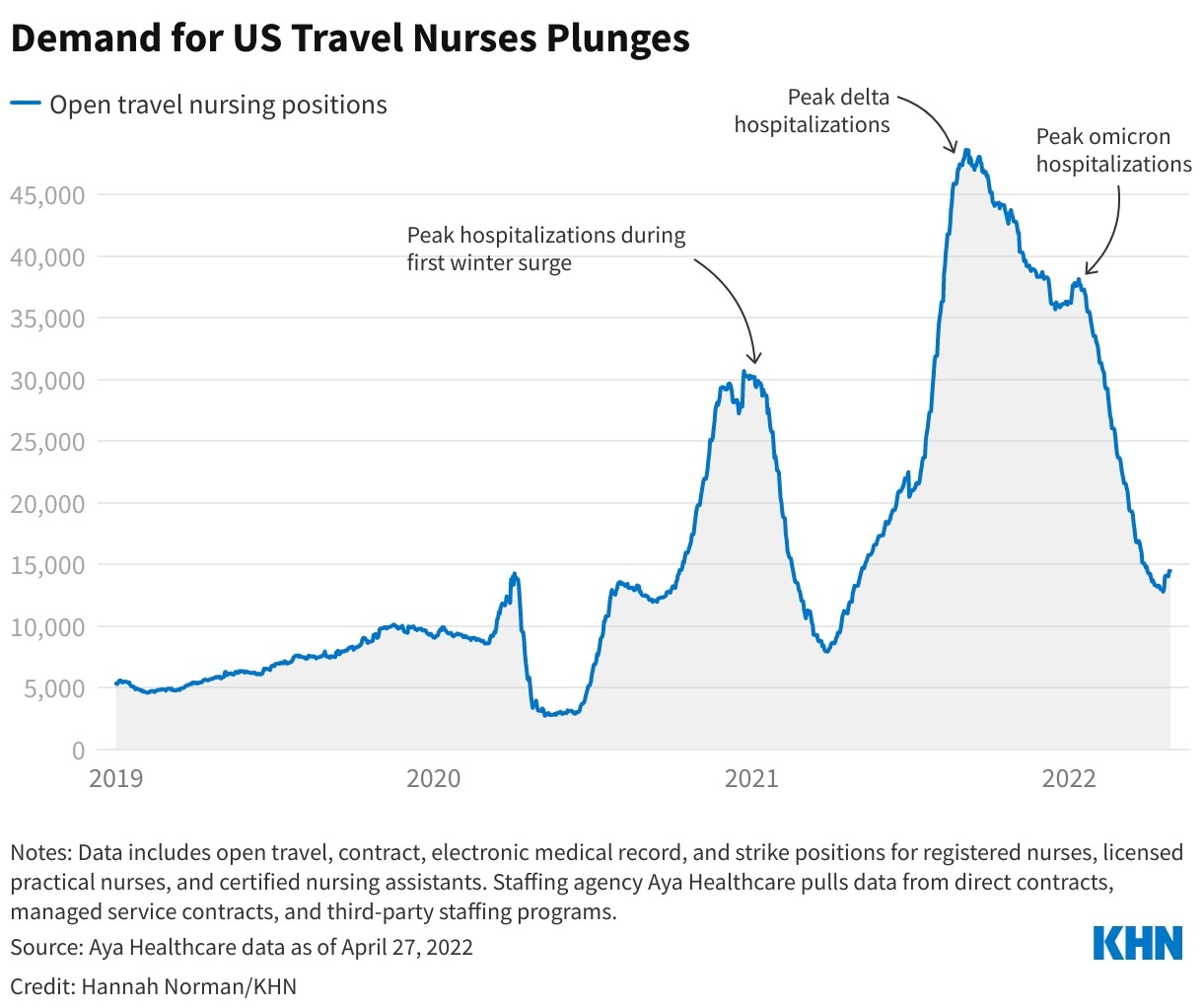 Nationally, demand for registered nurse travelers dropped by a third in the month leading up to April 10, according to data from staffing agency Aya Healthcare, although openings have rebounded slightly in recent weeks.