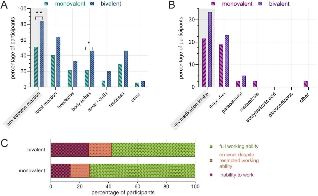Post-vaccination adverse reactions, PRN medication and inability to work following the second COVID-19 booster administration, separated by vaccine. A) rate of adverse reactions by subcategory, B) rate of PRN medication, C) work ability restrictions. Monovalent: BNT162b2mRNA (n=37), bivalent: BNT162b2mRNA original/Omicron BA.4-5 (n=39). **: p<0.01, *: p<0.05.