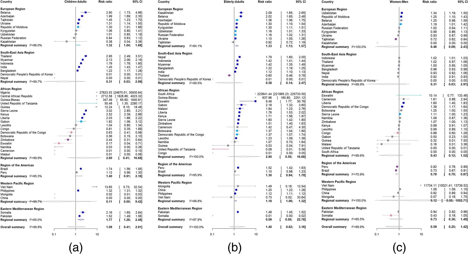 Risk ratios for disruption to tuberculosis notifications due to the pandemic for 45 high TB, TB/HIV and MDR-TB burden countries by WHO region for a children aged < 15 years compared to adults aged 15–64 years, b elderly aged ≥ 65 years compared to adults aged 15–64 years and c women aged ≥ 15 years compared to men aged ≥ 15 years. Risk ratios > 1 imply that the first population (children, the elderly or women) had a larger proportion of diagnoses missed or delayed in 2020 as a result of the pandemic. Risk ratios < 1 imply that the second population (adults or men) had a larger proportion of diagnoses missed or delayed in 2020 as a result of the pandemic. Countries, where there were more notifications in both the comparator and reference groups, were excluded from the meta-analysis. Colors indicate strength of evidence; no evidence for a risk ratio different to 1 (grey), strong evidence for a risk ratio > 1 (dark blue), evidence for a risk ratio > 1 (light blue), weak evidence for a risk ratio > 1 (green), strong evidence for a risk ratio < 1 (purple), evidence for a risk ratio < 1 (dark pink) and weak evidence for a risk ratio < 1 (light pink)