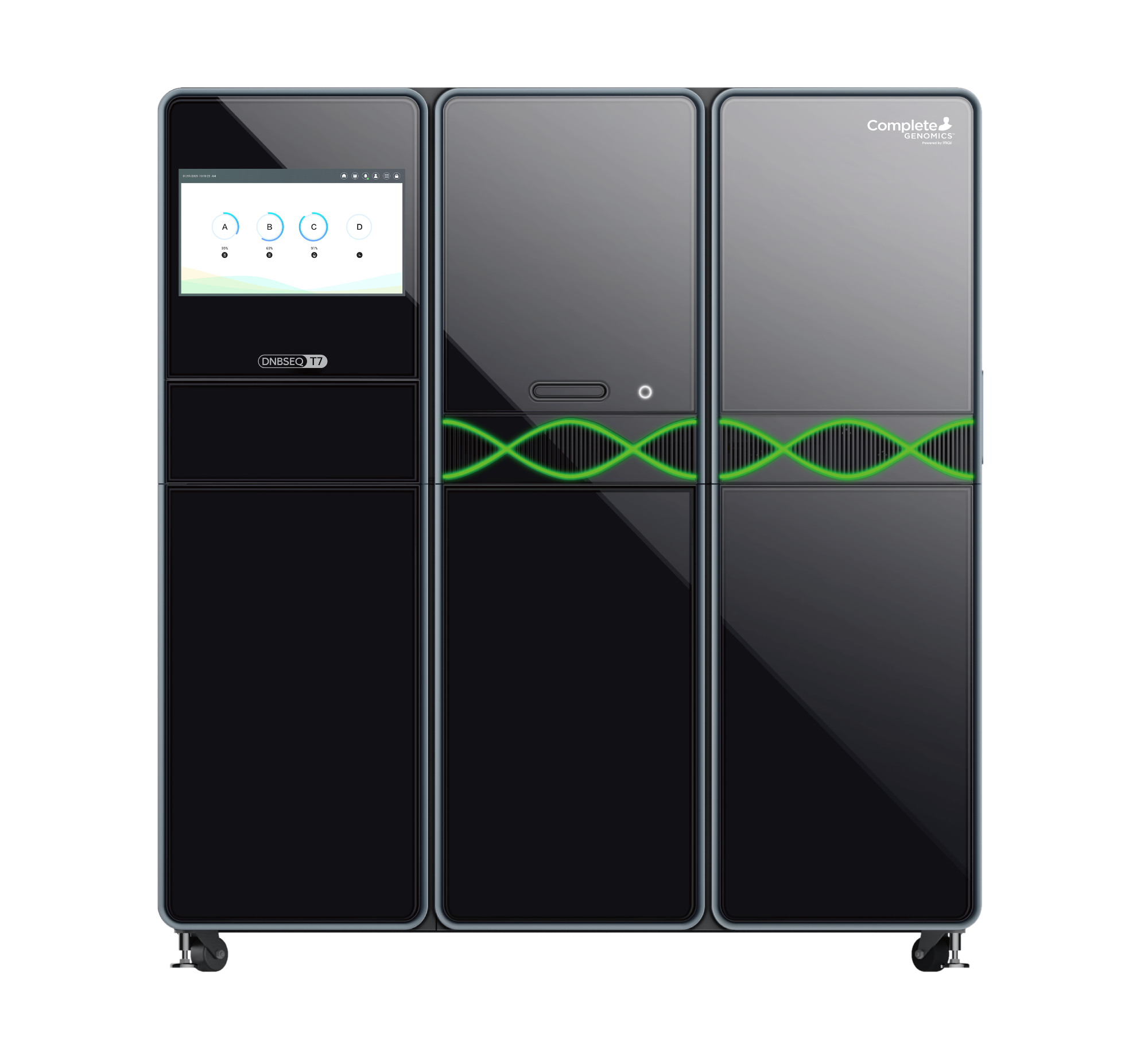 • DNBSEQ-T7* as an ultra-high throughput sequencer that offers one of the highest flexibilities among sequencers in the market with four independent flow cells running at any time. With an output of 1-7 Tb of high-quality data per day, it can achieve over 20,000 of 30X WGS in less than one year. This highly efficient and cost-effective sequencer is available now.