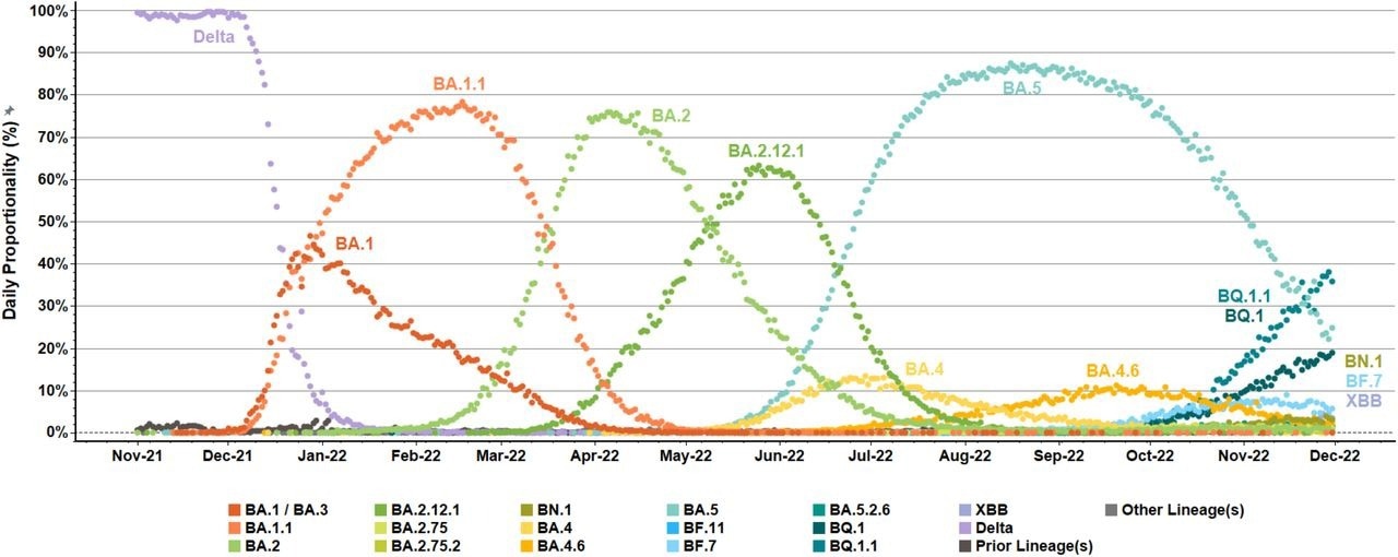 Emergence and diversification of SARS-CoV-2 Omicron variants and lineages in US surveillance networks. Daily, percent proportionalities (dot icons, 0% to 100%) were summarized for detected variant/lineage populations within US National SARS-CoV-2 Strain Surveillance (NS3) and baseline surveillance initiatives from November 1, 2021, to November 30, 2022. Reported sequences were aggregated and color-coded based on attributed Pango lineages. Delta (B.1.617.2) variant preceded the emergence and expansion of Omicron (B.1.1.529, BA) variant within US surveillance networks. Several tracked Omicron (BA) lineages (e.g., BA.2.75, BA.2.75.2, BF.11, and BA.5.2.6) were detected at low levels (≤10%, labels not shown). “Prior lineages” included additional A and B lineages with limited detection. “Other lineages” consolidated the few specimens with no assigned Pango nomenclature or non-XBB X lineage.