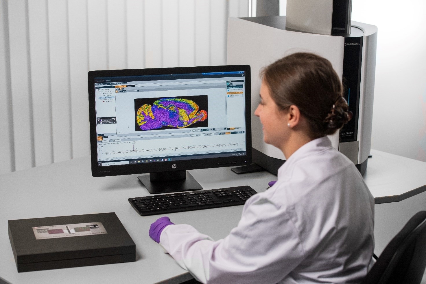 Shimadzu MALDI Benchtop Imaging solution showing the Starter Kit, the benchtop MALDI-TOF instrument and IonView imaging software on the monitor. Image credit: Shimadzu