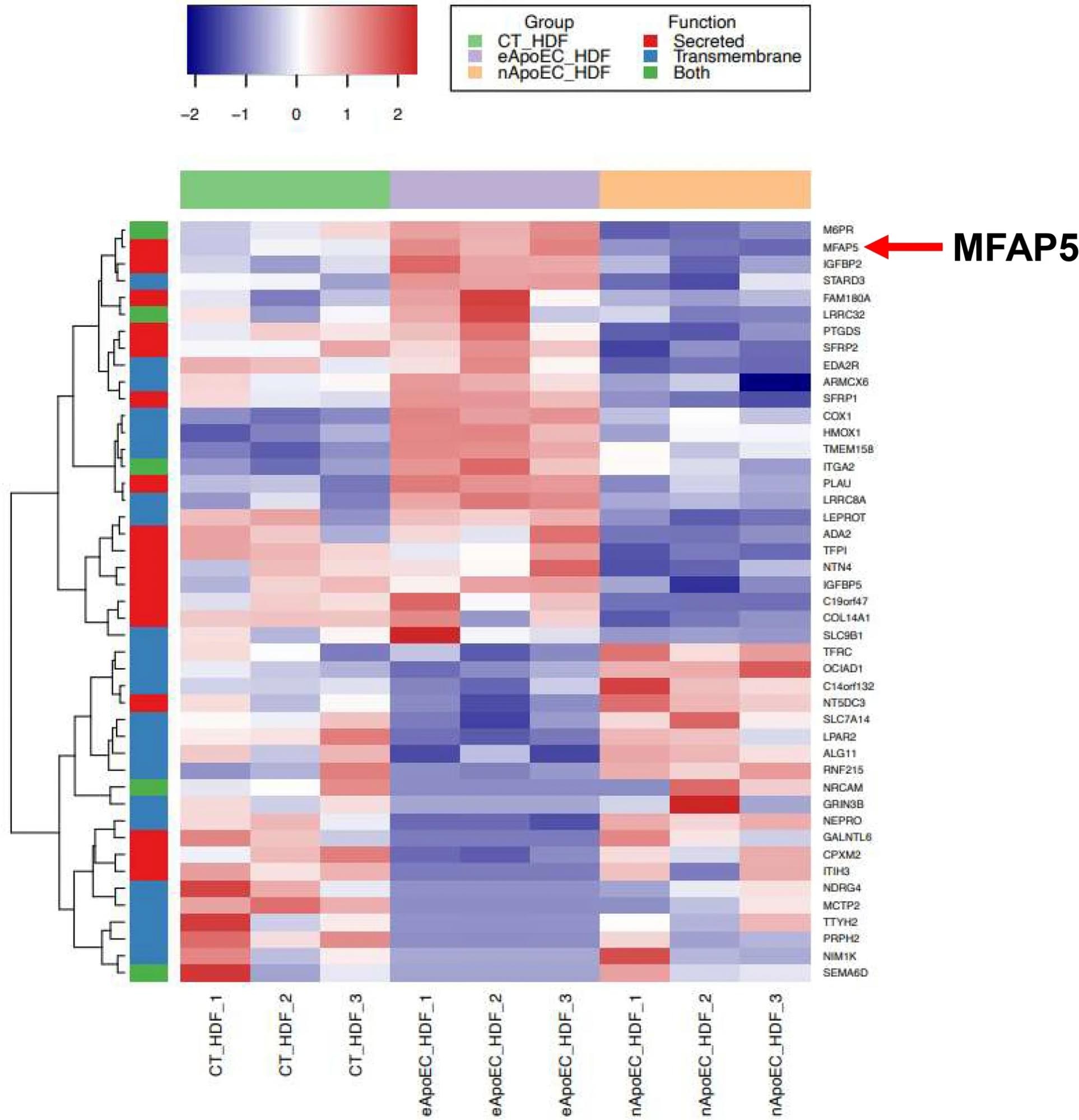 MFAP5 is upregulated in phagocytic fibroblasts. Heatmap of differentially expressed genes between phagocytic and non-phagocytic fibroblasts incubated with GFP-HDMECs (padj ≤ 0.05) that were identified as putative secreted proteins (red), transmembrane proteins (blue) or both (green). Genes were hierarchically clustered using the complete agglomeration method. Each row represents a gene, and each column represents an individual sample in the following groups: control fibroblasts (CT_HDF), fibroblasts phagocytosing apoptotic endothelial cells (eApoEC_HDF), and non-phagocytosing fibroblasts exposed to apoptotic endothelial cells (nApoEC_HDF). N = 3 for each group. The data used was log2 transformed count data. Adjusted p-values were calculated with a Wald test.