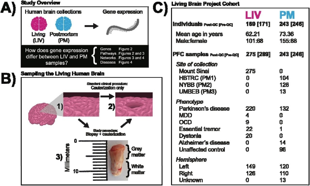 (A) Study Overview. The pink and blue colors represent LIV samples and PM samples, respectively, throughout all subsequent figures. (B) Sampling the Living Human Brain. The schematic illustrates that the standard clinical procedure and the modified study procedure amount to the same effective PFC volume loss. In 1) the state of the PFC at baseline is depicted. In 2) the final state of the PFC is depicted (i.e., the inner cylinder of tissue removed). The arrow and associated labels indicate how the final state of preparation is achieved in the standard clinical procedure (cauterization only) and the LBP procedure (biopsy followed by cauterization). Shown in 3) is a photograph of a PFC biopsy obtained for the LBP that i representative of the samples studied in this report. The top of the image is the anterior surface of the PFC. (C) Living Brain Project Cohort. Numbers refer to sample size (i.e., individuals or samples) except for age. The individual and sample numbers are identical for the PM cohort because only one sample was obtained per individual. Sample sizes inside and outside of the square brackets indicate counts prior to and after the application of quality control filters, respectively. [PFC = prefrontal cortex; QC = quality control; HBTRC (PM1) = Harvard Brain and Tissue Resource Center; NYBB (PM2) = New York Brain Bank at Columbia University; UMBEB (PM3) = University of Miami Brain Endowment Brain; MDD = major depressive disorder; OCD = obsessive-compulsive disorder]