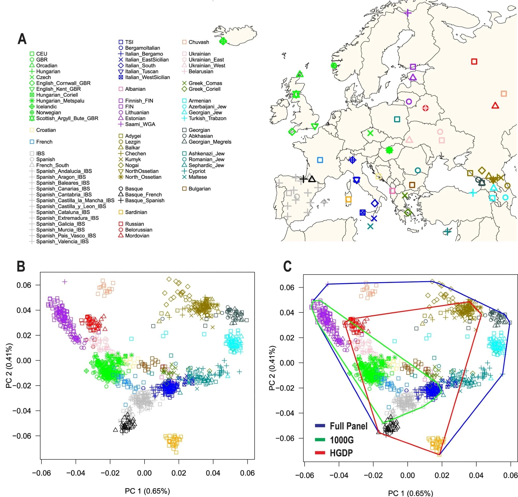 A) Map of Europe showing the geographic location of samples from 79 European populations. The map was drawn using the R package “maps” version 3.4.1. B) The first two principal components (PC1 and PC2) of genetic diversity and the percent variance explained. C) Coverage of genetic diversity over the first two principal components (convex hull area). 1000G = 1000 Genomes Project, HGDP Human Genome Diversity Project.