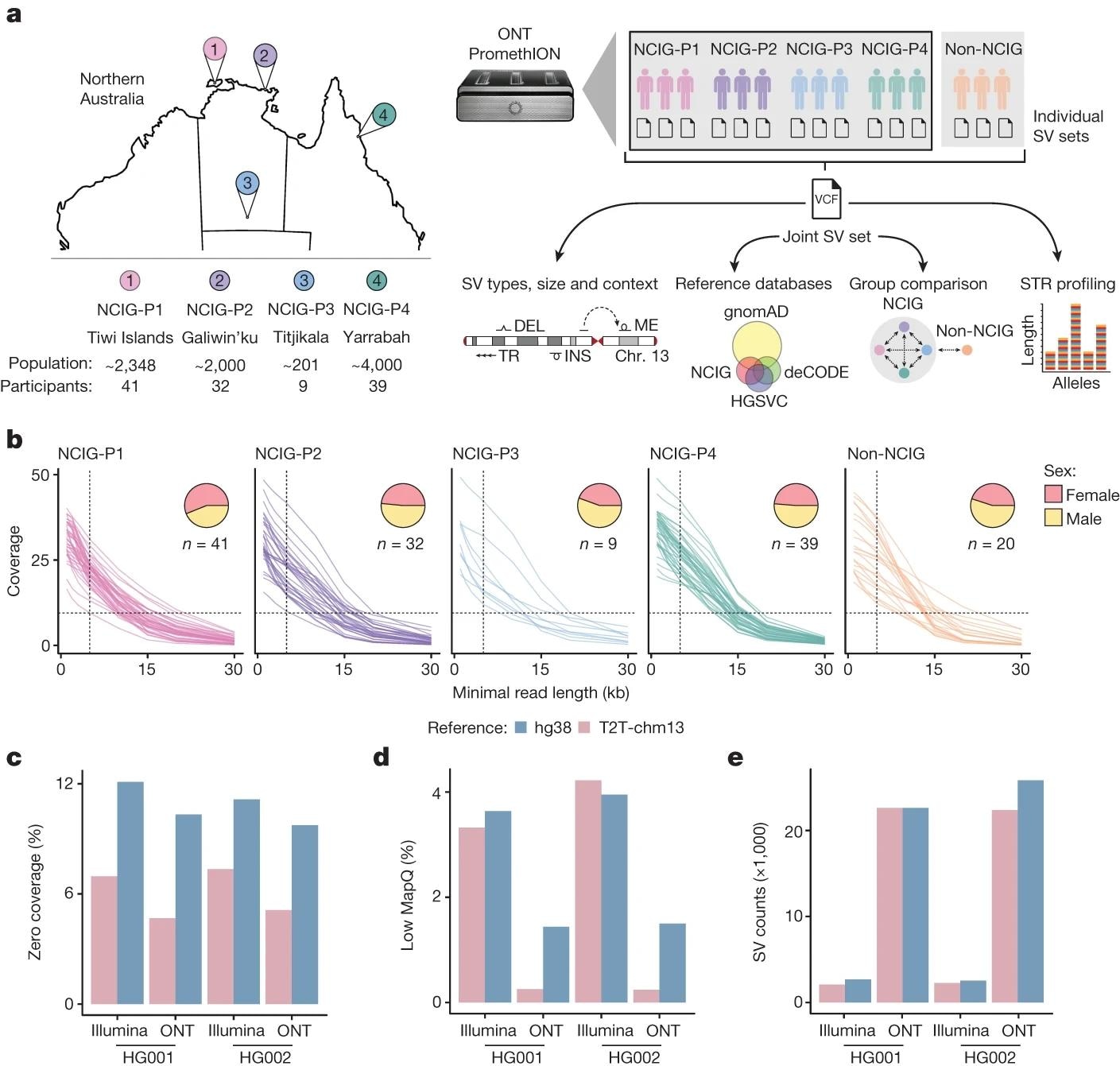 a, Study design and analysis workflow. DNA samples were collected from four Indigenous communities: Tiwi Islands (NCIG-P1), Galiwin’ku (P2), Titjikala (P3) and Yarrabah (P4), and from unrelated European individuals (non-NCIG). The map shows geographic locations, with population sizes and participant numbers underneath. ONT sequencing was performed and reads aligned to the T2T-chm13 genome. SVs were called for each individual, then joint calling was performed to generate a non-redundant set of SVs, genotyped for each individual. SVs were characterized by type, size and context and compared to existing SV datasets. SVs were compared between individuals and communities, with non-NCIG individuals as an outgroup. Short tandem repeat (STR) alleles were genotyped to assess variation. Chr, chromosome; DEL, deletions; INS, insertions; ME, mobile elements. b, Average genomic coverage as sequencing reads were filtered by a minimum read-length cut-off. Each line represents one individual. Pie charts show the proportion of male and female participants from each community. c, Percentage of genome with zero coverage for Illumina short-read and ONT long-read libraries from HG001 and HG002, aligned to either hg38 or T2T-chm13. d, Percentage of genome covered by alignments with low mapping quality (MAPQ < 5). e, Number of SVs detected.