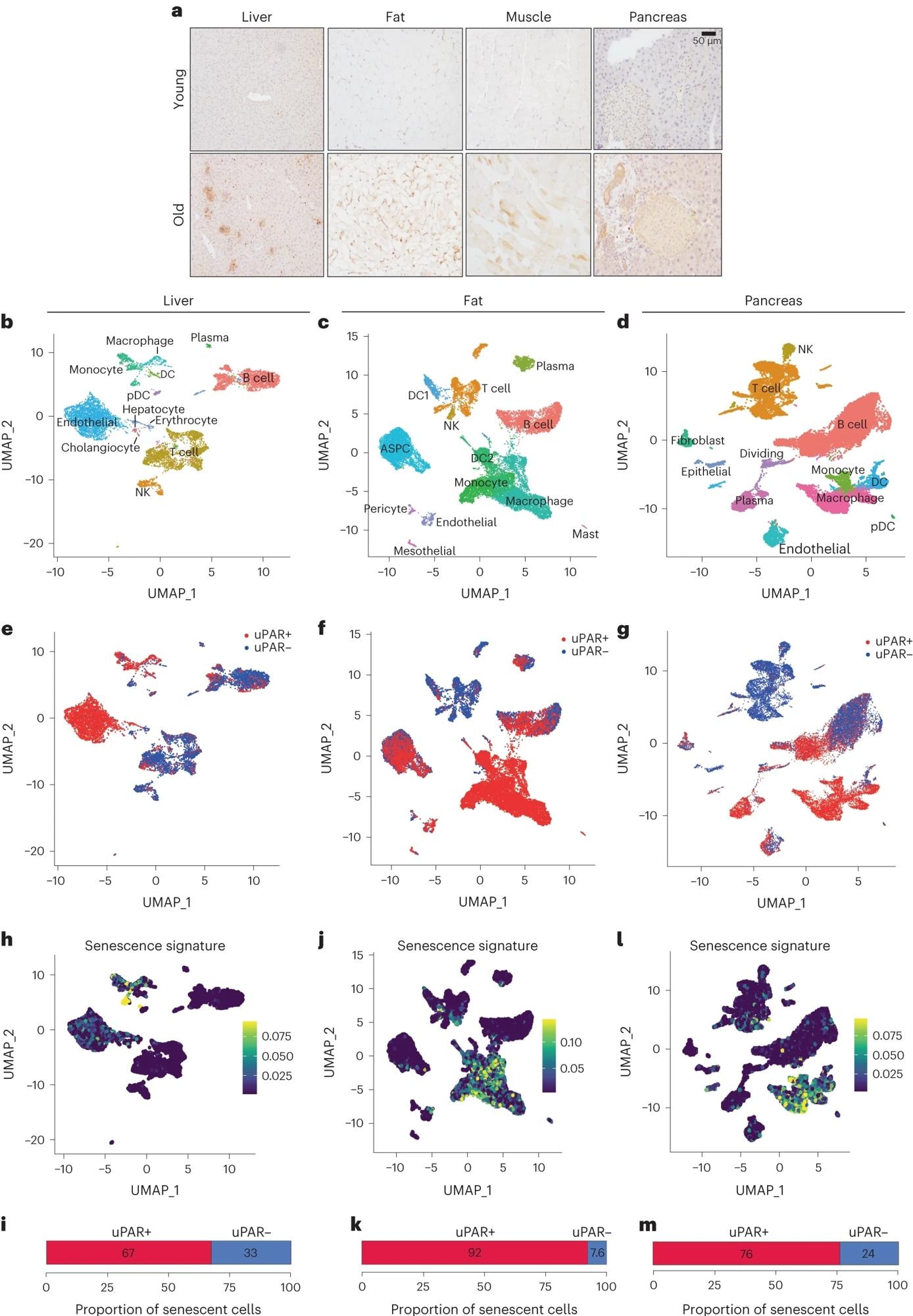 a, Immunohistochemical staining of mouse uPAR in liver, adipose tissue, muscle and pancreas from young (age 3 months) or old (age 20 months) mice (n = 3 per age). b–m, Single-cell analysis of uPAR expression and senescence. uPAR-positive and uPAR-negative cells were sorted from the liver, adipose tissue and pancreas of 20-month-old mice and subjected to single-cell RNA-seq by 10x chromium protocol (n = the sequencing of four mice where two females were combined into one replicate and two males were combined into another replicate). b, Uniform manifold approximation and projection (UMAP) visualization of liver cell types. c, UMAP visualization of adipose tissue cell types. d, UMAP visualization of pancreas cell types. e, UMAP visualization of hepatic uPAR-negative and uPAR-positive cell types. f, UMAP visualization of adipose uPAR-negative and uPAR-positive cell types. g, UMAP visualization of pancreatic uPAR-negative and uPAR-positive cell types. h,j,l, UMAP visualizations with senescence signature scores24 in each cell indicated by the color scale. i,k,m, Quantification of the proportion of uPAR-positive and uPAR-negative cells contributing to the respective senescence signature. h,i, Liver; j,k, adipose tissue; l,m, pancreas. Results are from one independent experiment (a–m). DC, dendritic cell; NK, natural killer; pDC, plasmacytoid dendritic cell; ASPC, adipose progenitor and stem cells.