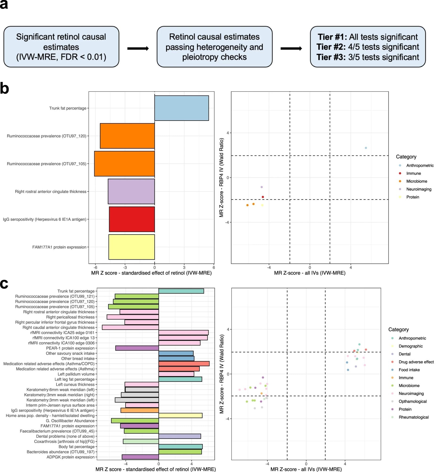 a Prioritisation pipeline overview for retinol causal estimates [inverse-variance weighted estimator with multiplicative random effects (IVW-MRE)] that survive multiple-testing correction (FDR < 0.01). These estimates are then subjected to tests for heterogeneity and pleiotropy (Online Methods), with a tier then assigned based on how many of the five Mendelian randomization (MR) methods applied are at least nominally statistically significant. In panels b and c, the left-hand plot denotes the Z-score (beta/SE) from the MR IVW-MRE estimates. Positive Z scores denote a positive IVW-MRE estimate of the effect of circulating retinol on that trait and vice versa. The traits are coloured by their broad phenotypic category. The right-hand plot visualizes the Z score using the IVW-MRE model versus that of the MR estimate using the RBP4 IV alone (Wald Ratio). The dotted lines approximately represent nominal statistical significance (P < 0.05). In panel b, just tier #2 traits are plotted (Online Methods), whilst panel c plots both tier #2 and tier #3 traits.a Prioritisation pipeline overview for retinol causal estimates [inverse-variance weighted estimator with multiplicative random effects (IVW-MRE)] that survive multiple-testing correction (FDR < 0.01). These estimates are then subjected to tests for heterogeneity and pleiotropy (Online Methods), with a tier then assigned based on how many of the five Mendelian randomization (MR) methods applied are at least nominally statistically significant. In panels b and c, the left-hand plot denotes the Z-score (beta/SE) from the MR IVW-MRE estimates. Positive Z scores denote a positive IVW-MRE estimate of the effect of circulating retinol on that trait and vice versa. The traits are coloured by their broad phenotypic category. The right-hand plot visualizes the Z score using the IVW-MRE model versus that of the MR estimate using the RBP4 IV alone (Wald Ratio). The dotted lines approximately represent nominal statistical significance (P < 0.05). In panel b, just tier #2 traits are plotted (Online Methods), whilst panel c plots both tier #2 and tier #3 traits.