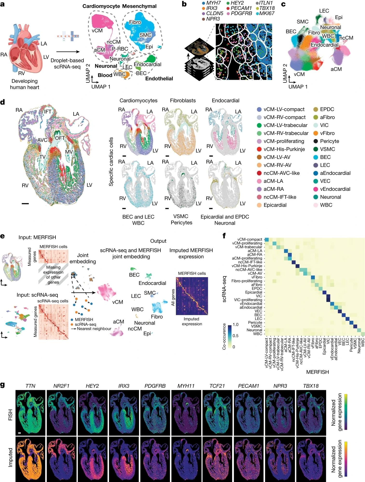 a, Left, schematic of experiment. Right, scRNA-seq identifies a diverse range of distinct cardiac cells that create the developing human heart as displayed by uniform manifold approximation and projection (UMAP) of ~143,000 cells. b, Schematic shows how 238 cardiac-cell-specific genes were spatially identified using MERFISH. Pseudo-coloured dots mark the location of individual molecules of ten specific RNA transcripts. c, Approximately 250,000 MERFISH-identified cardiac cells were clustered into specific cell populations as shown by UMAP and coloured accordingly in d. d, Identified MERFISH cells were spatially mapped across a frontal section of a 13 p.c.w. heart (left) and shown according to major cell classes (right). e, Joint embedding between MERFISH and age-matched scRNA-seq datasets enabled cell label transfer and MERFISH gene imputation. f, Co-occurrence heatmap shows the correspondence of cell annotations of MERFISH cells to those transferred from the 13 p.c.w. scRNA-seq dataset. g, Gene imputation performance was validated spatially by comparing normalized gene expression profiles of marker genes measured by MERFISH with the corresponding imputed gene expression profiles. Epi, epicardial; MV, mitral valve; P–RBC, platelet–red blood cell; TV, tricuspid valve. Scale bar, 250 µm (g). Illustration in a was created using BioRender (https://www.biorender.com).