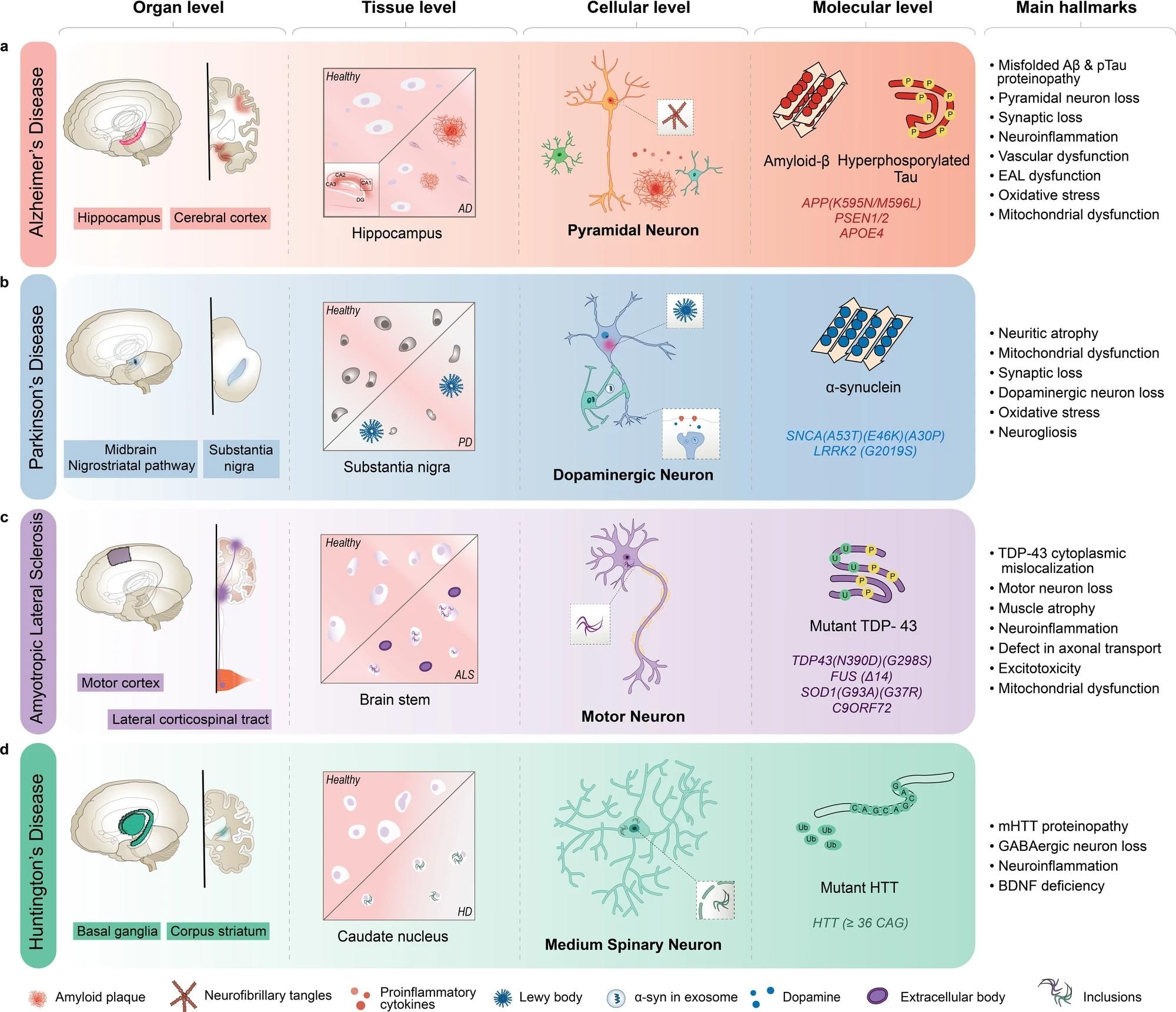 AD is characterized by the inclusion of misfolded amyloid-β (Aβ) and neurofibrillary tangles in pyramidal neurons, primarily in the hippocampus and cortex regions of the brain. b PD is characterized by Lewy body aggregates composed of misfolded α-synuclein and degeneration of dopaminergic neurons in the substantia nigra region of the brain. c ALS is characterized by including mutant TAR DNA-binding protein 43 (TDP-43) and other proteins, degeneration of motor neurons in the motor cortex and spinal cord, and muscle atrophy with dysfunctional proteins. d HD is characterized by including mutant Huntingtin protein (mHTT) and degeneration of medium spiny neurons in the basal ganglia, and corpus striatum of the brain. AD Alzheimer’s disease, ALS amyotrophic lateral sclerosis, BDNF brain-derived neurotrophic factor, EAL endosomal-autophagic-lysosomal pathway, GABA gamma-aminobutyric acid, HD Huntington’s disease, PSEN presenilin 1, SNCA synuclein alpha.