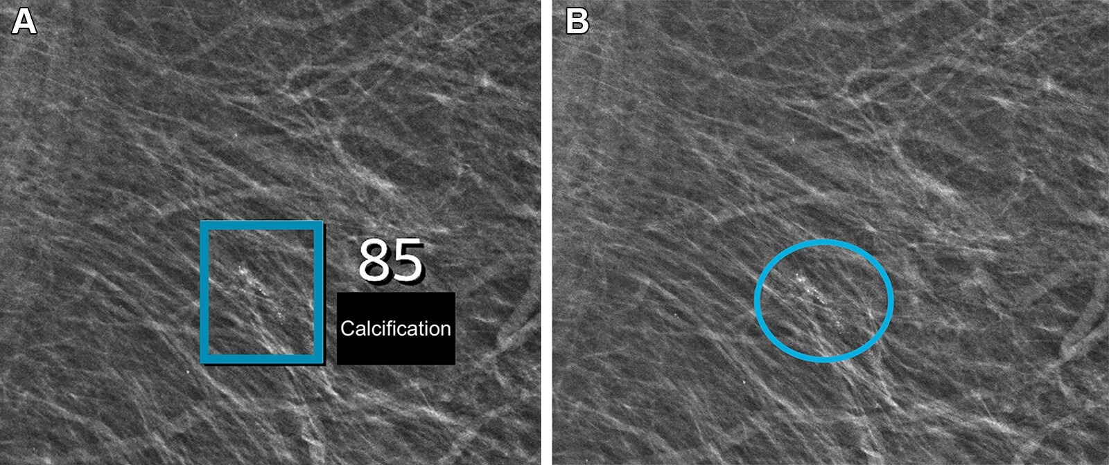 Left mediolateral oblique full-field digital mammographic view in a 67-year-old woman with a Breast Imaging Reporting and Data System density of 1 who underwent screening with the artificial intelligence (AI) system. (A) Image shows AI-provided marking (square). The screening received a high AI examination score of 10, based on this area with arterial calcifications being given a score of 85 out of 100 by the AI system. (B) Same image as in A, but with findings by the radiologists. Because of the high AI examination score, the screening was double read by two radiologists, who determined that the arterial calcifications (circle) did not yield suspicions for breast cancer. The woman was not recalled for diagnostic assessment.
