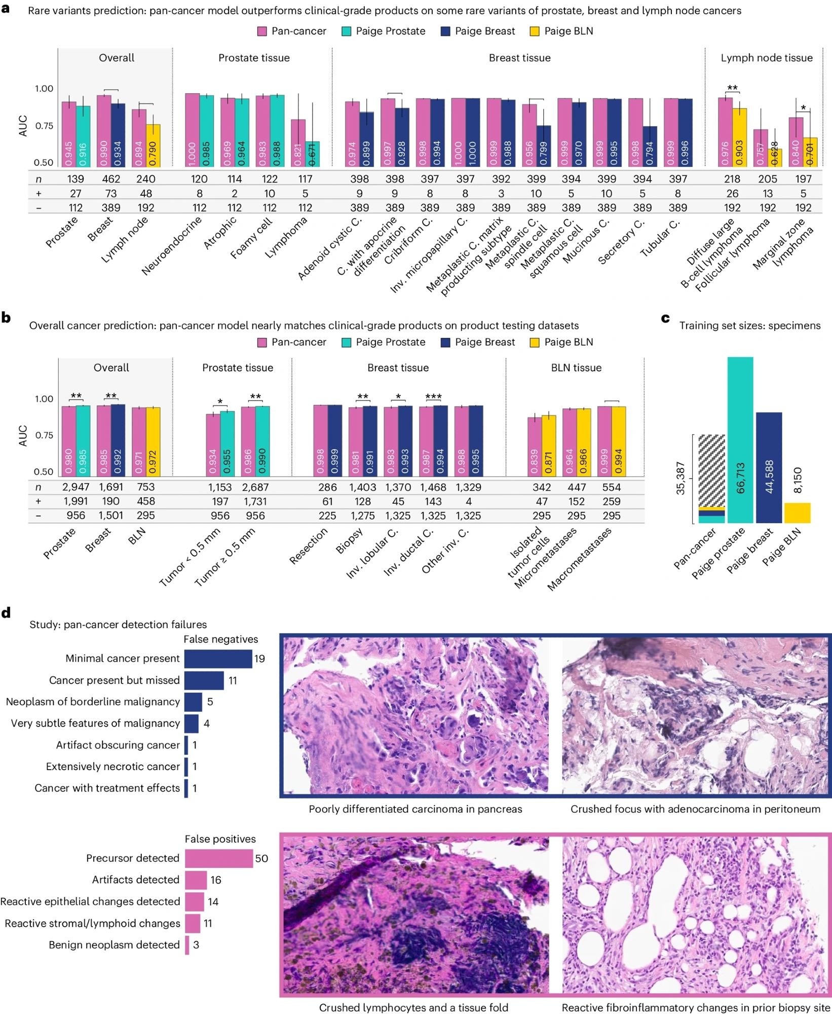 a,b, Performance as measured by AUC of three clinical products compared to the pan-cancer model trained on Virchow embeddings, on the rare variant (a) and product testing datasets (b). The pan-cancer detector, trained on Virchow foundation model embeddings, achieves similar performance to clinical-grade products in general and outperforms them on rare variants of cancers. c, The pan-cancer detector was trained on fewer labeled specimens than the Prostate, Breast and BLN clinical models, including a small fraction of the prostate (teal), breast (blue) and BLN (yellow) tissue specimens that these clinical models were respectively trained on. d, A categorization of failure models of the pan-cancer model and four canonical examples of the primary types of failures. In all panels, * is used to indicate pairwise statistical significance (*P < 0.05, **P < 0.01, ***P < 0.001, ****P < 0.0001; pairwise DeLong’s test). Error bars denote the two-sided 95% confidence interval, estimated with DeLong’s method. C., carcinoma. Inv., invasive.a,b, Performance as measured by AUC of three clinical products compared to the pan-cancer model trained on Virchow embeddings, on the rare variant (a) and product testing datasets (b). The pan-cancer detector, trained on Virchow foundation model embeddings, achieves similar performance to clinical-grade products in general and outperforms them on rare variants of cancers. c, The pan-cancer detector was trained on fewer labeled specimens than the Prostate, Breast and BLN clinical models, including a small fraction of the prostate (teal), breast (blue) and BLN (yellow) tissue specimens that these clinical models were respectively trained on. d, A categorization of failure models of the pan-cancer model and four canonical examples of the primary types of failures. In all panels, * is used to indicate pairwise statistical significance (*P < 0.05, **P < 0.01, ***P < 0.001, ****P < 0.0001; pairwise DeLong’s test). Error bars denote the two-sided 95% confidence interval, estimated with DeLong’s method. C., carcinoma. Inv., invasive.
