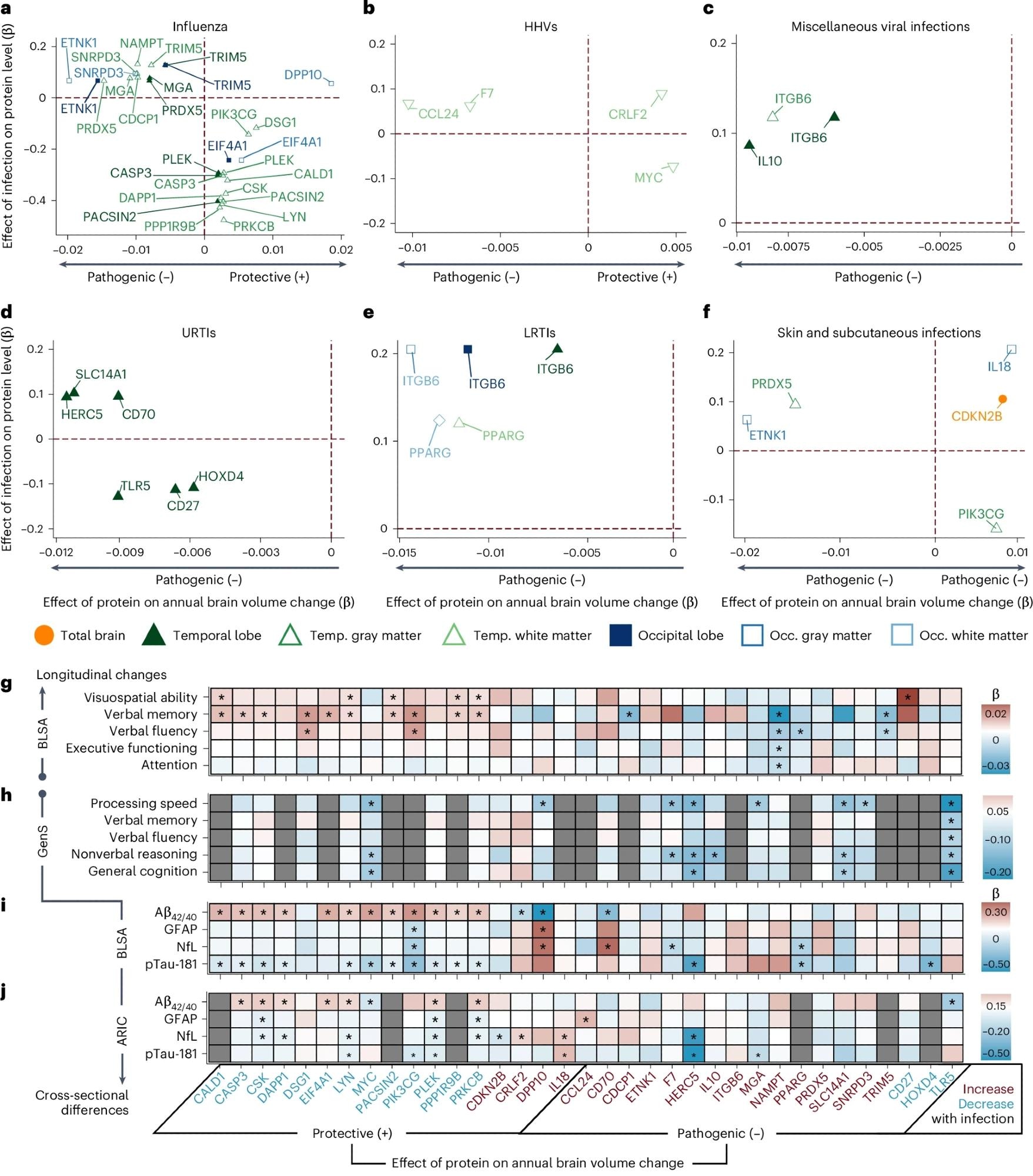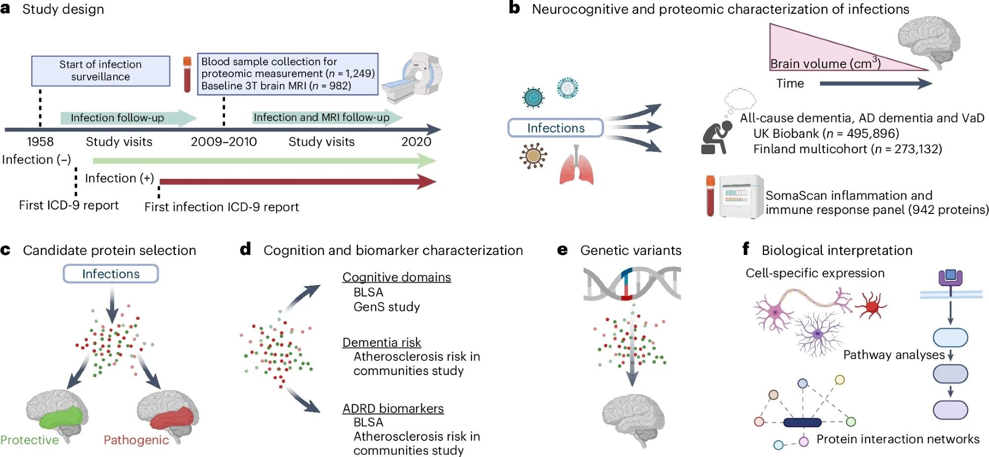 a, BLSA participants were classified according to the presence or absence of infection diagnoses using ICD-9 codes collected at study visits as early as 1958. Repeated 3T MRI scans were initiated in 2009–2010. Blood samples were collected at the initial 3T MRI scan and, for a subset of participants, at the time of a first PET scan as part of a separate study. b, Analyses examined how infection diagnoses are associated with brain volume changes over time and an immunological plasma proteome in the BLSA, as well as risk of all-cause dementia, AD dementia and VaD in the UK Biobank and a Finnish multicohort sample (the FPS study, the HeSSup study, and the STW study). c, Candidate proteins were selected if they were associated with an infection and related to changes in brain regions vulnerable to infection-specific atrophy, and were defined as protective or pathogenic, depending on whether they predicted preserved or reduced longitudinal brain volumes, respectively. d, Candidate proteins were related to longitudinal performance across five cognitive domains (the BLSA), cross-sectional performance across five cognitive domains (the GenS study), dementia risk (the ARIC study), and ADRD biomarkers (Aβ42/40, GFAP, NfL, pTau-181; the BLSA and the ARIC study). e, Genetic variants that influenced candidate protein levels were associated with changes in brain volumes in the BLSA and an external cohort (the ENIGMA consortium). f, The biological implications and functional relevance of candidate proteins were assessed using a variety of complementary analytical tools and open-source databases. All panels were created with BioRender.a, BLSA participants were classified according to the presence or absence of infection diagnoses using ICD-9 codes collected at study visits as early as 1958. Repeated 3T MRI scans were initiated in 2009–2010. Blood samples were collected at the initial 3T MRI scan and, for a subset of participants, at the time of a first PET scan as part of a separate study. b, Analyses examined how infection diagnoses are associated with brain volume changes over time and an immunological plasma proteome in the BLSA, as well as risk of all-cause dementia, AD dementia and VaD in the UK Biobank and a Finnish multicohort sample (the FPS study, the HeSSup study, and the STW study). c, Candidate proteins were selected if they were associated with an infection and related to changes in brain regions vulnerable to infection-specific atrophy, and were defined as protective or pathogenic, depending on whether they predicted preserved or reduced longitudinal brain volumes, respectively. d, Candidate proteins were related to longitudinal performance across five cognitive domains (the BLSA), cross-sectional performance across five cognitive domains (the GenS study), dementia risk (the ARIC study), and ADRD biomarkers (Aβ42/40, GFAP, NfL, pTau-181; the BLSA and the ARIC study). e, Genetic variants that influenced candidate protein levels were associated with changes in brain volumes in the BLSA and an external cohort (the ENIGMA consortium). f, The biological implications and functional relevance of candidate proteins were assessed using a variety of complementary analytical tools and open-source databases. All panels were created with BioRender.