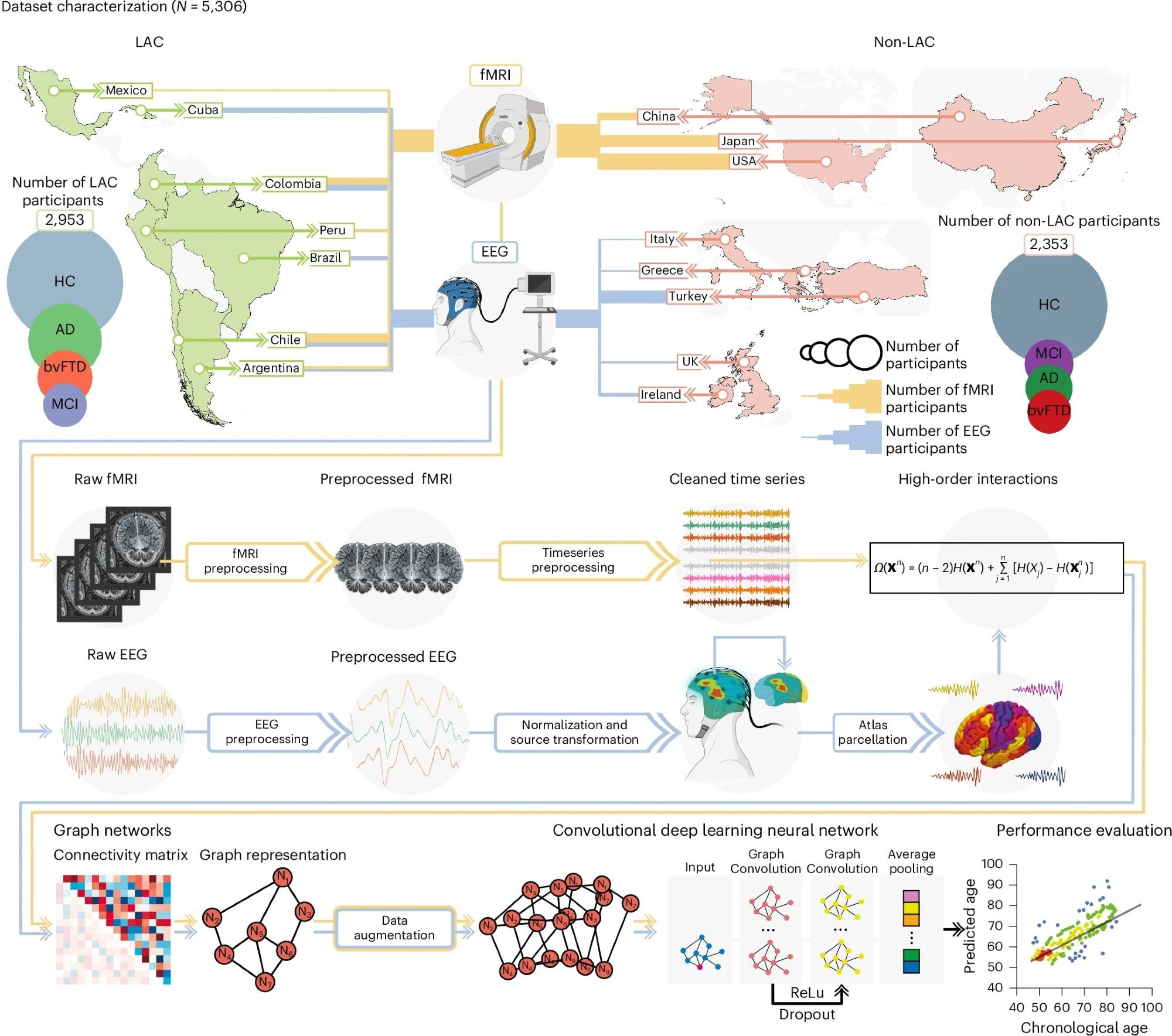 ​​​​​​​Datasets included LAC and non-LAC healthy controls (HC, total n = 3,509) and participants with Alzheimer disease (AD, total n = 828), bvFTD (total n = 463) and MCI (total n = 517). The fMRI dataset included 2,953 participants from LAC (Argentina, Chile, Colombia, Mexico and Peru) as well as non-LAC (the USA, China and Japan). The EEG dataset involved 2,353 participants from Argentina, Brazil, Chile, Colombia and Cuba (LAC) as well as Greece, Ireland, Italy, Turkey and the UK (non-LAC). The raw fMRI and EEG signals were preprocessed by filtering and artifact removal and the EEG signals were normalized to project them into source space. A parcellation using the automated anatomical labeling (AAL) atlas for both the fMRI and EEG signals was performed to build the nodes from which we calculated the high-order interactions using the Ω-information metric. A connectivity matrix was obtained for both modalities, which was later represented by graphs. Data augmentation was performed only in the testing dataset. The graphs were used as input for a graph convolutional deep learning network (architecture shown in the last row), with separate models for EEG and fMRI. Finally, age prediction was obtained, and the performance was measured by comparing the predicted versus the chronological ages. This figure was partially created with BioRender.com (fMRI and EEG devices).​​​​​​​Datasets included LAC and non-LAC healthy controls (HC, total n = 3,509) and participants with Alzheimer disease (AD, total n = 828), bvFTD (total n = 463) and MCI (total n = 517). The fMRI dataset included 2,953 participants from LAC (Argentina, Chile, Colombia, Mexico and Peru) as well as non-LAC (the USA, China and Japan). The EEG dataset involved 2,353 participants from Argentina, Brazil, Chile, Colombia and Cuba (LAC) as well as Greece, Ireland, Italy, Turkey and the UK (non-LAC). The raw fMRI and EEG signals were preprocessed by filtering and artifact removal and the EEG signals were normalized to project them into source space. A parcellation using the automated anatomical labeling (AAL) atlas for both the fMRI and EEG signals was performed to build the nodes from which we calculated the high-order interactions using the Ω-information metric. A connectivity matrix was obtained for both modalities, which was later represented by graphs. Data augmentation was performed only in the testing dataset. The graphs were used as input for a graph convolutional deep learning network (architecture shown in the last row), with separate models for EEG and fMRI. Finally, age prediction was obtained, and the performance was measured by comparing the predicted versus the chronological ages. This figure was partially created with BioRender.com (fMRI and EEG devices).