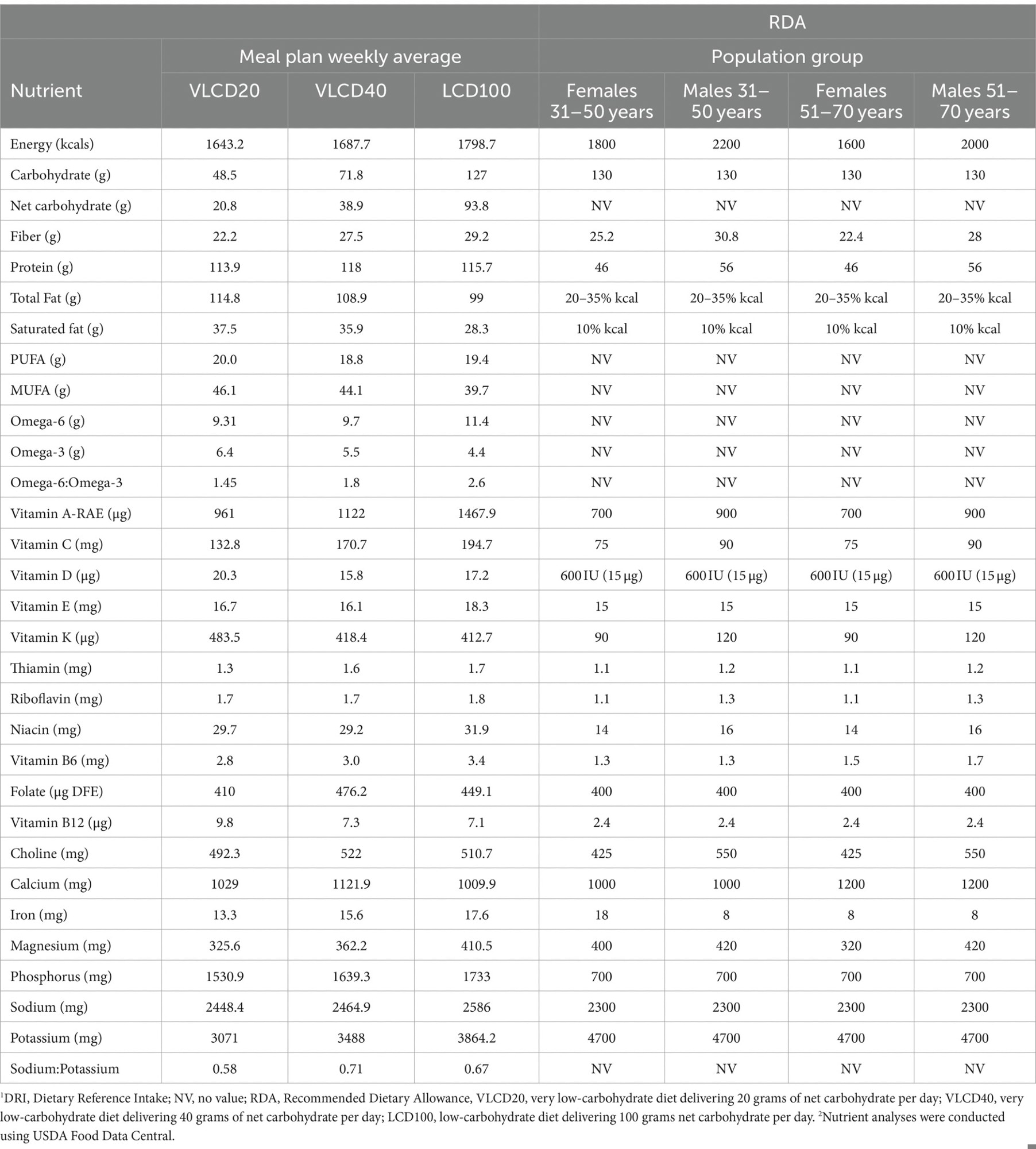 The energy and nutrient analysis of three diet plans indicated that two very low-carbohydrate diets with 20 grams and 40 grams of carbohydrates (VLCD20 and VLCD40) and the low-carbohydrate diet with 100 grams of carbohydrate (LCD100) provide 91%, 94%, and 100% of the RDA for energy, respectively, in females aged 31 – 70 years.