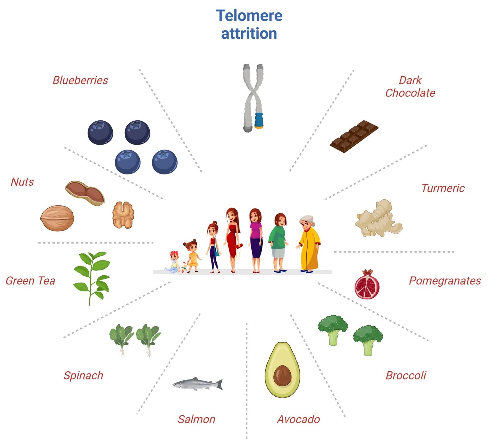 Adherence to the Mediterranean diet has been linked to longer telomeres in different populations. By contrast, diets with processed foods, unhealthy fats, and sugars have been associated with shorter TLs and accelerated aging. Superfoods such as nuts, blueberries, spinach, salmon, broccoli, avocado, turmeric, dark chocolate, pomegranates, and green tea have been identified as protective against telomere shortening. Incorporating these foods can help slow the telomere shortening rate and promote healthier aging.