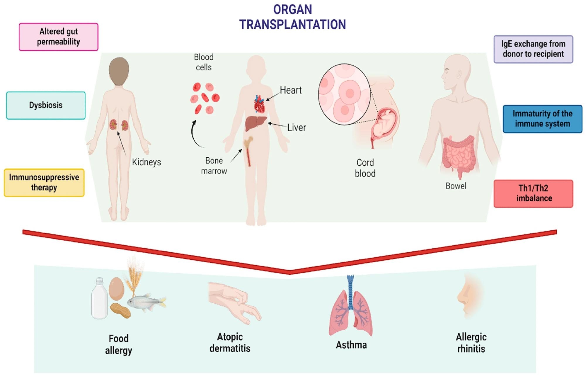 Transplant-acquired food allergies typically affect children who have undergone organ transplantation to manage end-state organ failure, cancer, or autoimmune diseases. Epidemiological studies indicate that food allergies often occur in children who have undergone liver transplantation. However, these allergies have also been reported in children who have received heart, lung, cord blood, kidney, or intestine transplants.