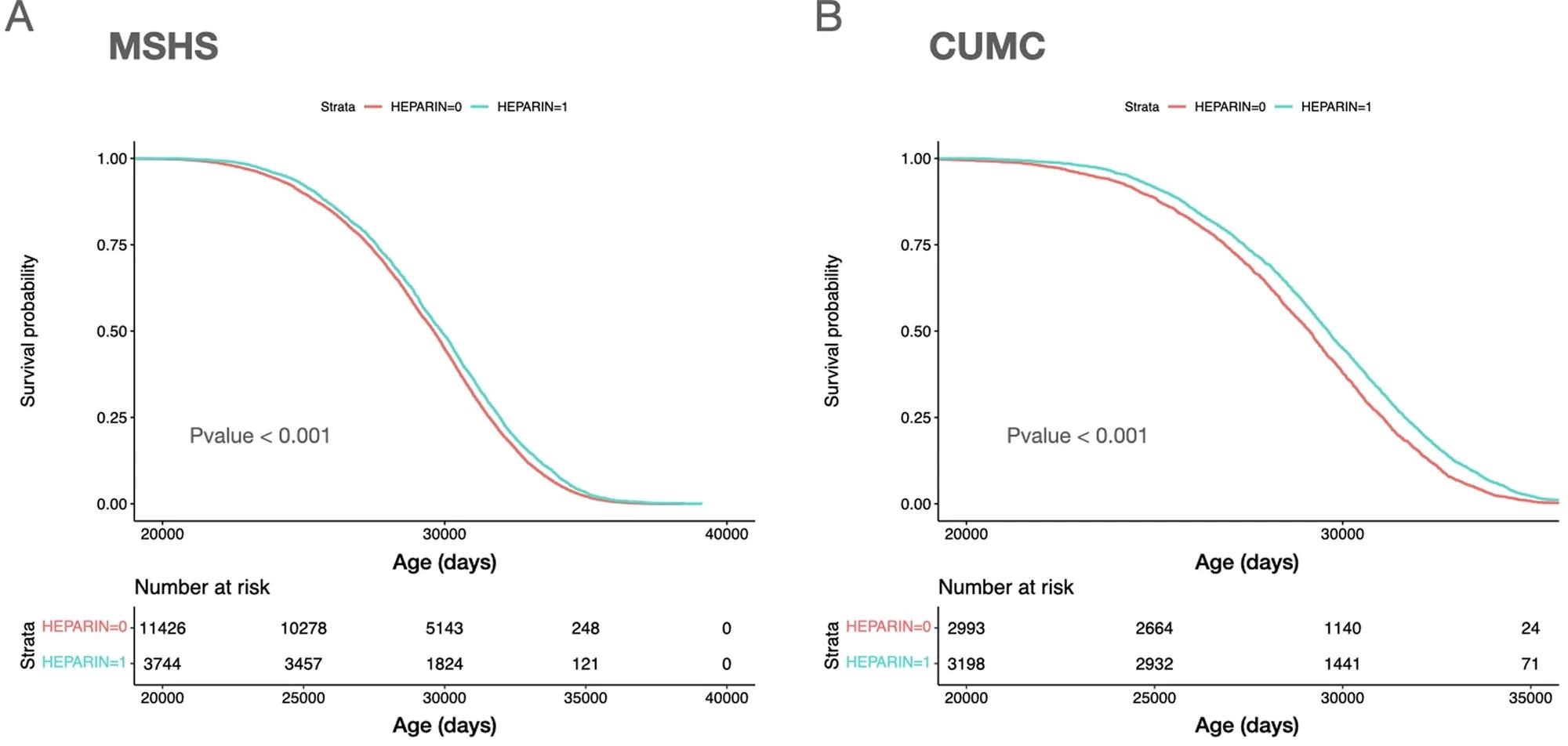 There were 15,183 eligible patients in the first health system (MSHS) and 6,207 in the second (CUMC). In the MSHS cohort, 24.7% had been treated with heparin, and 75.3% had not, while in the CUMC cohort, 51.5% had received heparin. On average, those who received heparin in the first health database (MSHS) were diagnosed with Alzheimer’s one year later than those who had not received the treatment. In the second set of health records (CUMC), those who received heparin were diagnosed with Alzheimer’s two years later than those who had not.