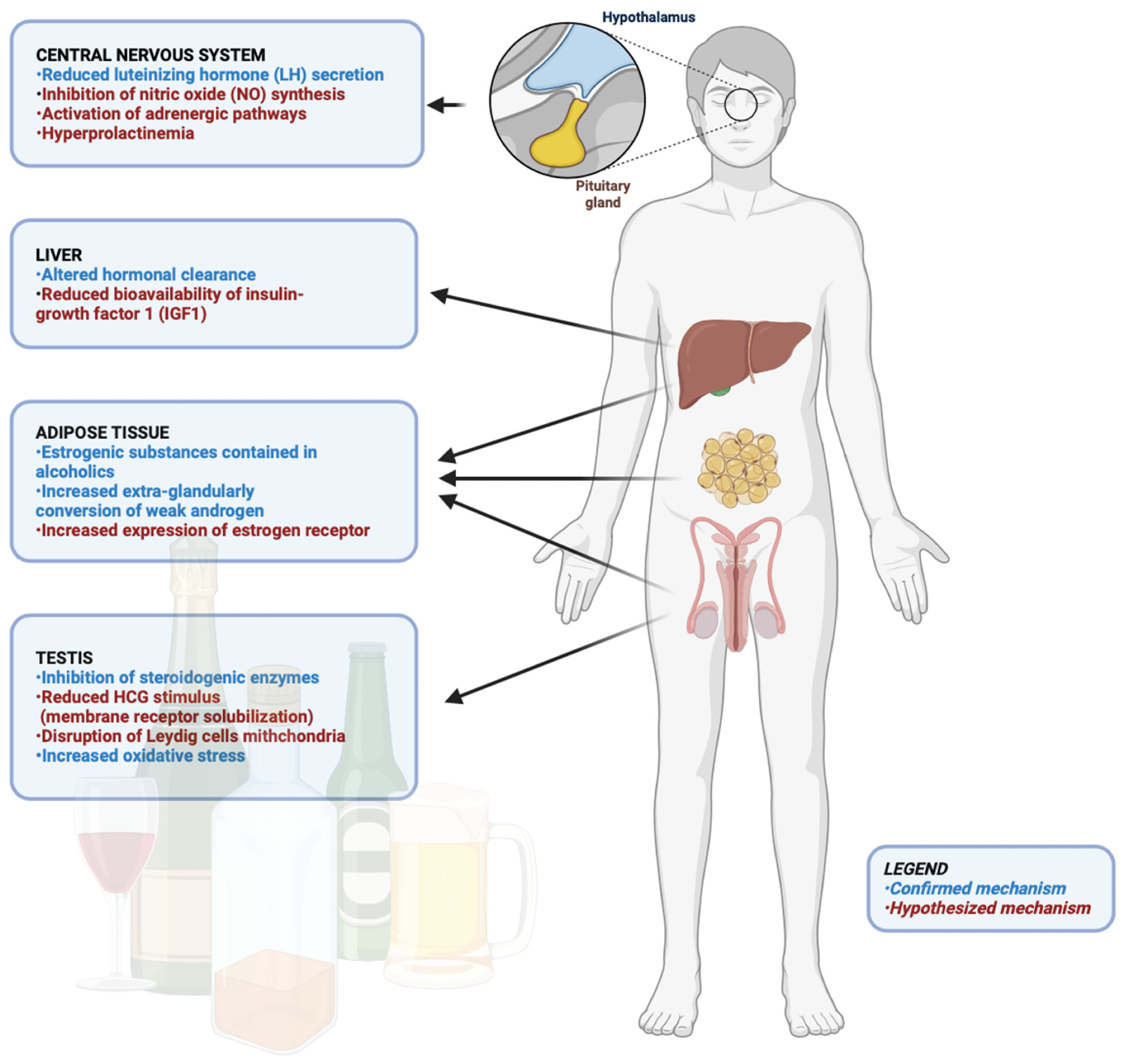Alcohol abuse, especially binge drinking, often leads to feminization symptoms due to hyperestrogenism and oxidative stress-induced damage to Leydig cells. These effects vary with alcohol dose, liver health, and individual factors. Notably, the impacts of alcohol on testosterone production during adolescence, a critical developmental stage, remain underexplored and warrant further investigation.