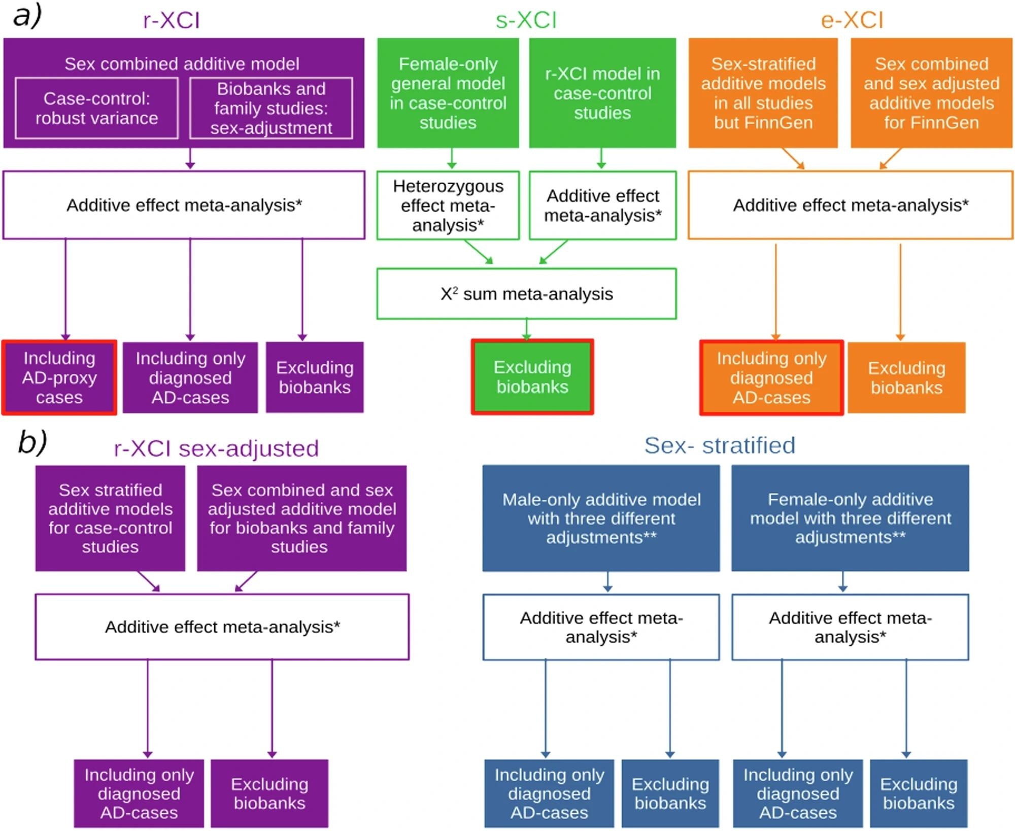 a Main analyses and b sensitivity analyses. Box colors indicate the approach: purple, green, orange and blue represent r-XCI, s-XCI, e-XCI and sex-stratified approaches, respectively. Boxes circled in red are the main r-XCI, s-XCI and e-XCI analyses. *Fixed effect meta-analysis with an inverse-variance weighted approach as implemented in METAL. **Sex-stratified models were adjusted on 1) principal components (PCs) and/or the genotyping center; 2) PCs, center and age; 3) PCs, center, age and APOE.a Main analyses and b sensitivity analyses. Box colors indicate the approach: purple, green, orange and blue represent r-XCI, s-XCI, e-XCI and sex-stratified approaches, respectively. Boxes circled in red are the main r-XCI, s-XCI and e-XCI analyses. *Fixed effect meta-analysis with an inverse-variance weighted approach as implemented in METAL. **Sex-stratified models were adjusted on 1) principal components (PCs) and/or the genotyping center; 2) PCs, center and age; 3) PCs, center, age and APOE.