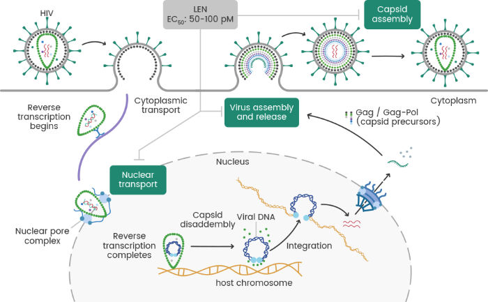 LEN is a first-in-class, long-acting HIV-1 capsid inhibitor that disrupts multiple stages of the viral replication cycle. By binding to the capsid protein, it blocks the nuclear import of HIV-1 proviral DNA, preventing its integration into the host genome. Additionally, it disrupts capsid core formation, resulting in structurally defective virions, and interferes with Gag/Gag-Pol function, reducing proper virus assembly and release. This multistage inhibition gives LEN potent antiviral activity, even against drug-resistant HIV-1 strains. Administered subcutaneously every six months after an oral lead-in phase, its extended half-life (8–12 weeks) ensures sustained viral suppression, offering a promising option for individuals with multidrug-resistant HIV or those seeking alternatives to daily therapy (Figure 1).