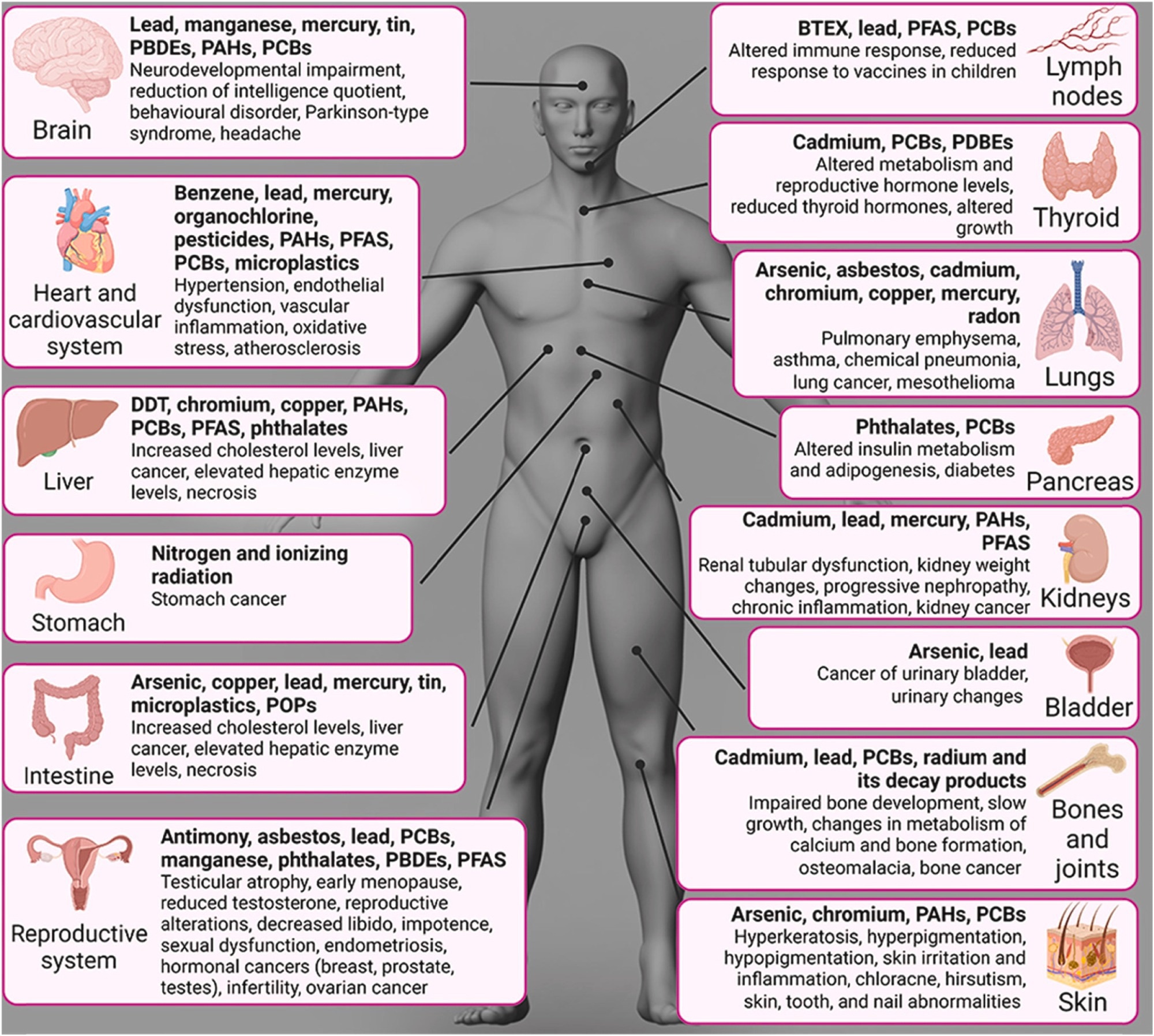 Main effects of soil contaminants on human health, indicating the organs or systems affected and the contaminants causing them. PCBs, polychlorinated biphenyls; PBDEs, polybrominated diphenyl ethers; PFAS, per- and polyfluoroalkyl substances; POPs, persistent organic pollutants; BTEX, refers to the chemicals benzene, toluene, ethylbenzene, and xylene. Adapted from the report of the Food and Agriculture Organization of the United Nations (created from data in the Agency for Toxic Substances and Disease Registry and Campanale et al., https://www. fao.org/3/cb4894en/online/src/html/chapter-04-3.html