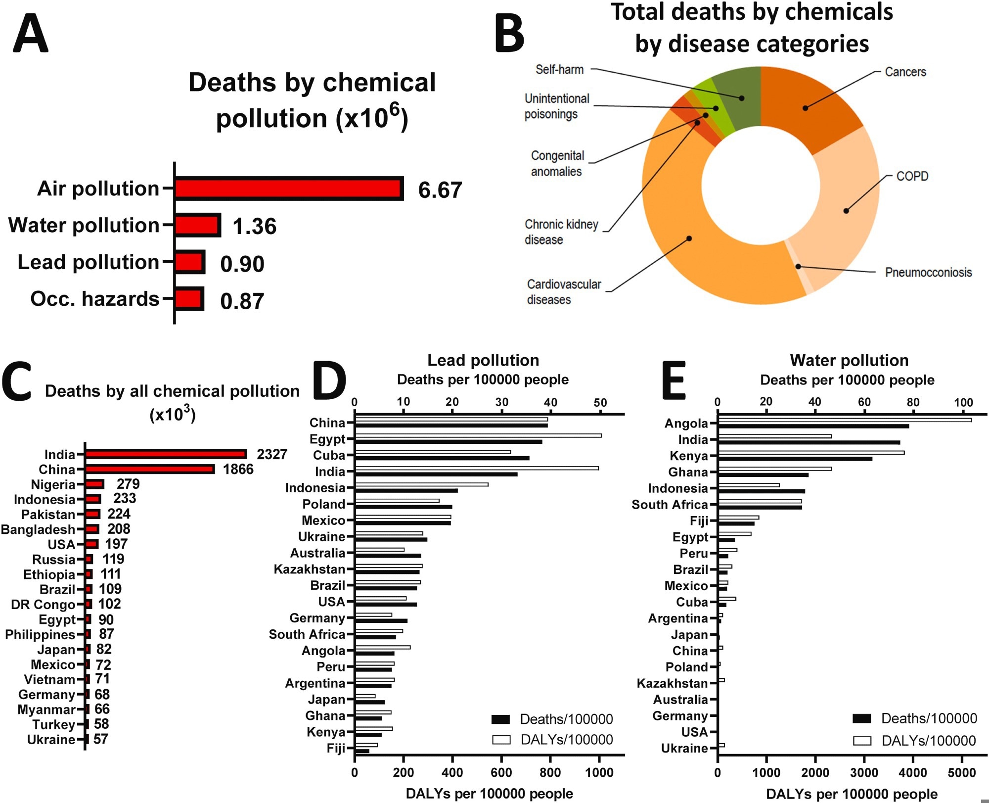 Impact of chemical pollution from various sources on the global burden of premature deaths. Estimated global annual deaths by all sources of chemical pollution (A) and the disease entities being associated with these deaths (B). (C) Deaths by all chemical pollution – ranking by top 20 countries. Population-related rates of death and disability-adjusted life years (DALYs) for lead pollution as a typical soil pollutant (D) and water pollution (unsafe water source including chemical hazards) (E), listed for 20 representative countries of different WHO regions.