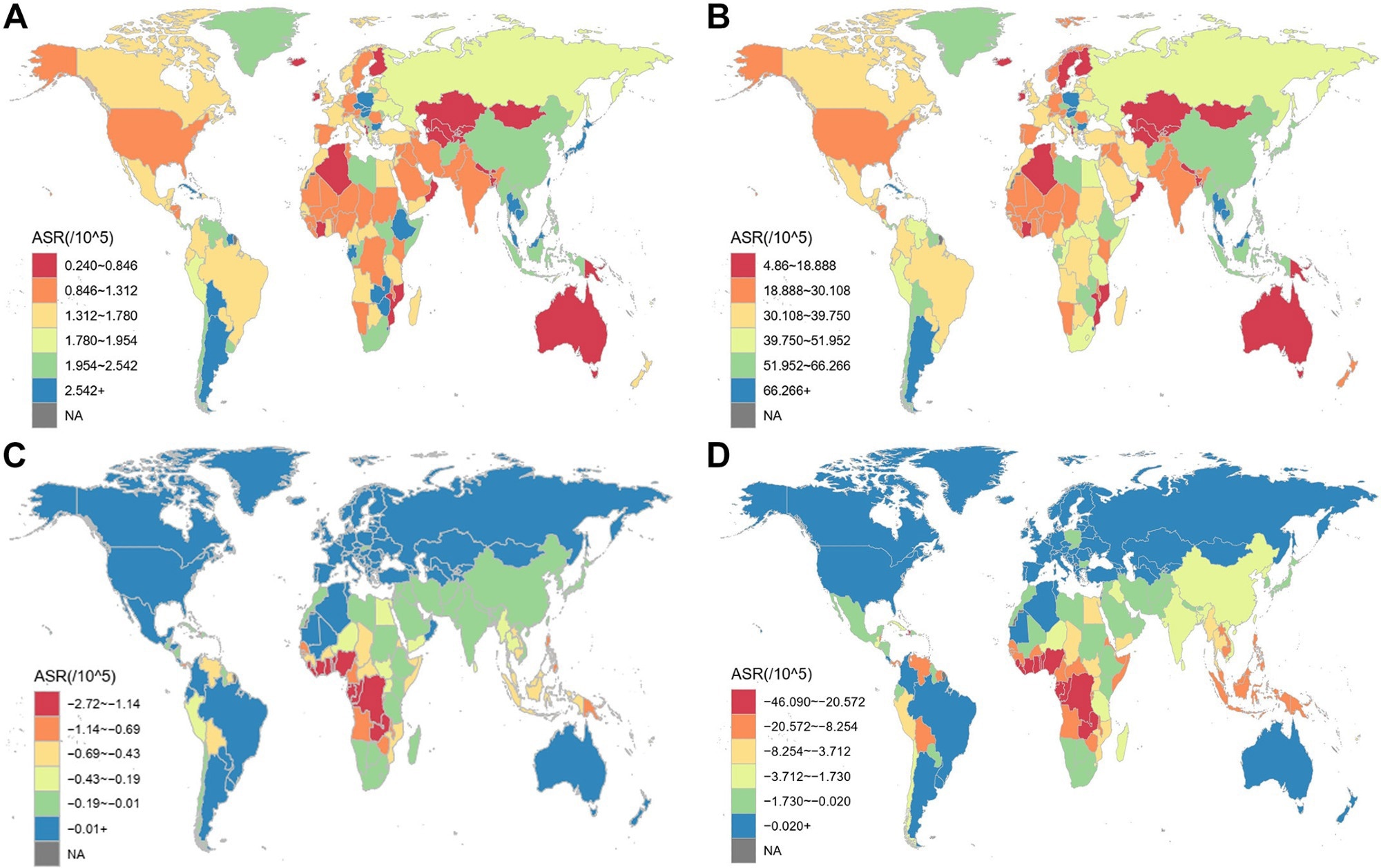 The ASR of deaths and DALYs attributable to diet low in milk for prostate cancer and colon and rectum cancer among countries and territories in 2021. A. ASMR of colon and rectum cancer; B. ASDR of colon and rectum cancer; C. ASMR of prostate cancer; D. ASDR of prostate cancer. ASMR, age-standardized mortality rate; ASDR, age-standardized DALY rate; DALYs, disability-adjusted life year rates. Study: Global, regional, and national burden of disease attributable to diet low in milk, 1990-2021: an updated analysis of the Global Burden of Disease study 2021.