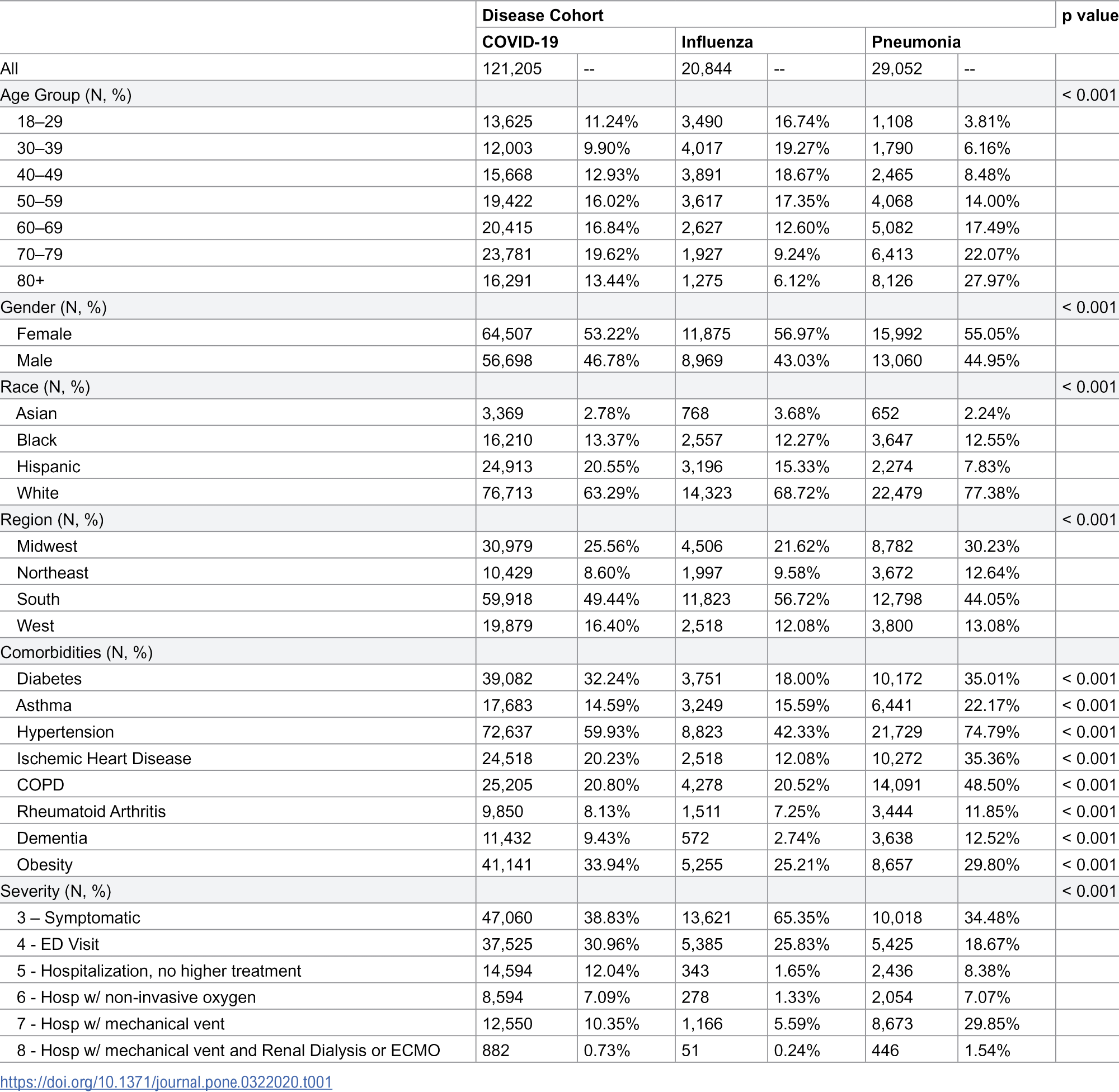 Potential predictors of symptoms were gender, ethnicity/race, age, US region, and comorbidities (hypertension, diabetes, obesity, dementia, asthma, rheumatoid arthritis, chronic obstructive pulmonary disease [COPD], chronic renal disease, and ischemic heart disease). The disease severity index was adapted from the World Health Organization. The 10-point severity index was modified, and only six levels were considered.