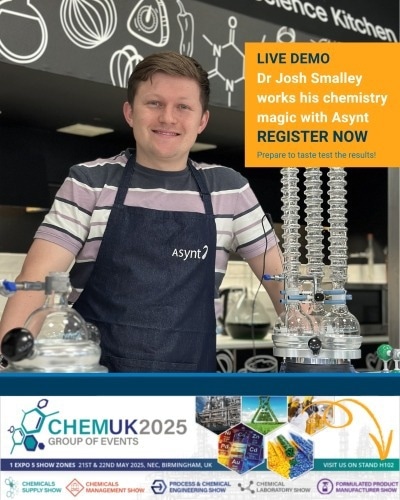Asynt is delighted to announce a unique and inspiring live demo at this year’s highly anticipated CHEMUK exhibition, taking place on 21st–22nd May 2025 at the NEC, Birmingham. Visitors to Stand H102 on day two will be treated to a special “edible chemistry” demo, presented by Dr Josh Smalley, chemist, science communicator, and finalist on The Great British Bake Off.