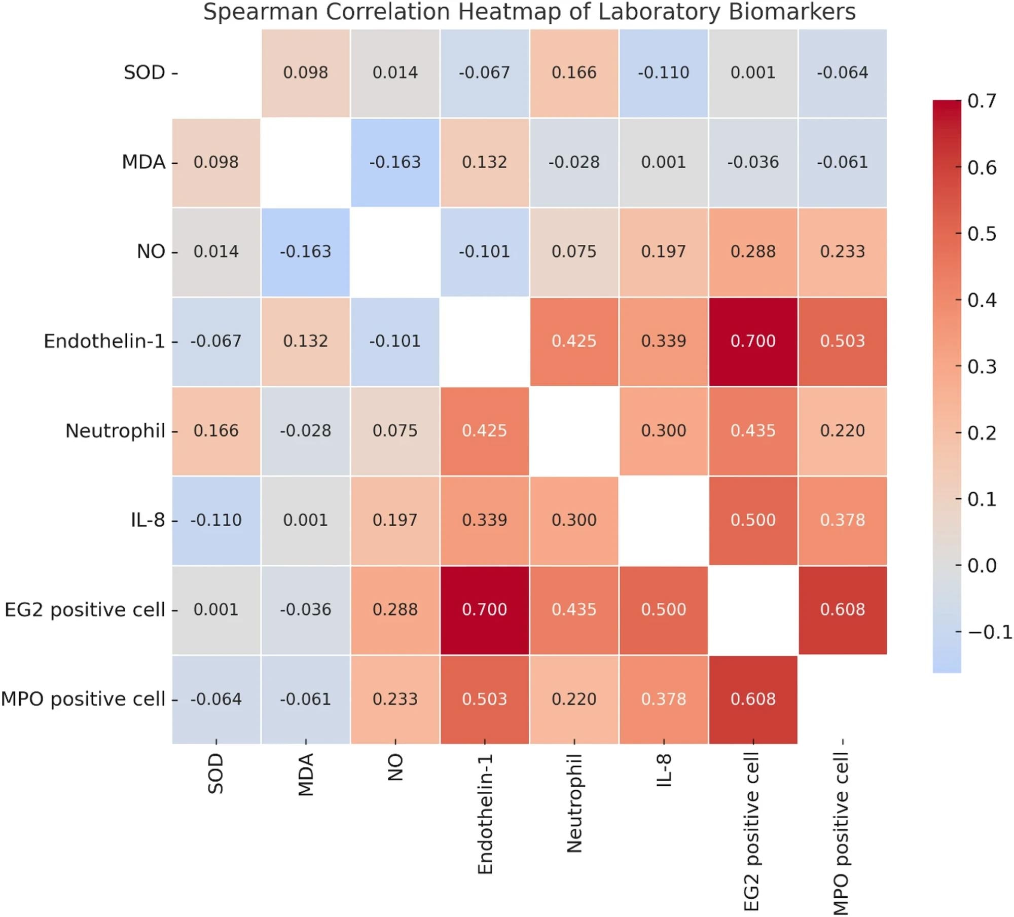 Spearman correlation heatmap among oxidative stress markers, inflammatory mediators, and granulocyte-related biomarkers in smokers. The figure illustrates the strength and direction of correlations between superoxide dismutase (SOD), malondialdehyde (MDA), nitric oxide (NO), endothelin-1, neutrophils, interleukin-8 (IL-8), EG2-positive eosinophils, and myeloperoxidase (MPO)-positive cells. Strong positive correlations were observed between EG2-positive cells and endothelin-1, IL-8, and MPO-positive cells, highlighting a potential interplay between oxidative stress and eosinophilic inflammation in smoking-associated pathophysiology. Significant correlations (p < 0.05) are indicated in the figureSpearman correlation heatmap among oxidative stress markers, inflammatory mediators, and granulocyte-related biomarkers in smokers. The figure illustrates the strength and direction of correlations between superoxide dismutase (SOD), malondialdehyde (MDA), nitric oxide (NO), endothelin-1, neutrophils, interleukin-8 (IL-8), EG2-positive eosinophils, and myeloperoxidase (MPO)-positive cells. Strong positive correlations were observed between EG2-positive cells and endothelin-1, IL-8, and MPO-positive cells, highlighting a potential interplay between oxidative stress and eosinophilic inflammation in smoking-associated pathophysiology. Significant correlations (p < 0.05) are indicated in the figure