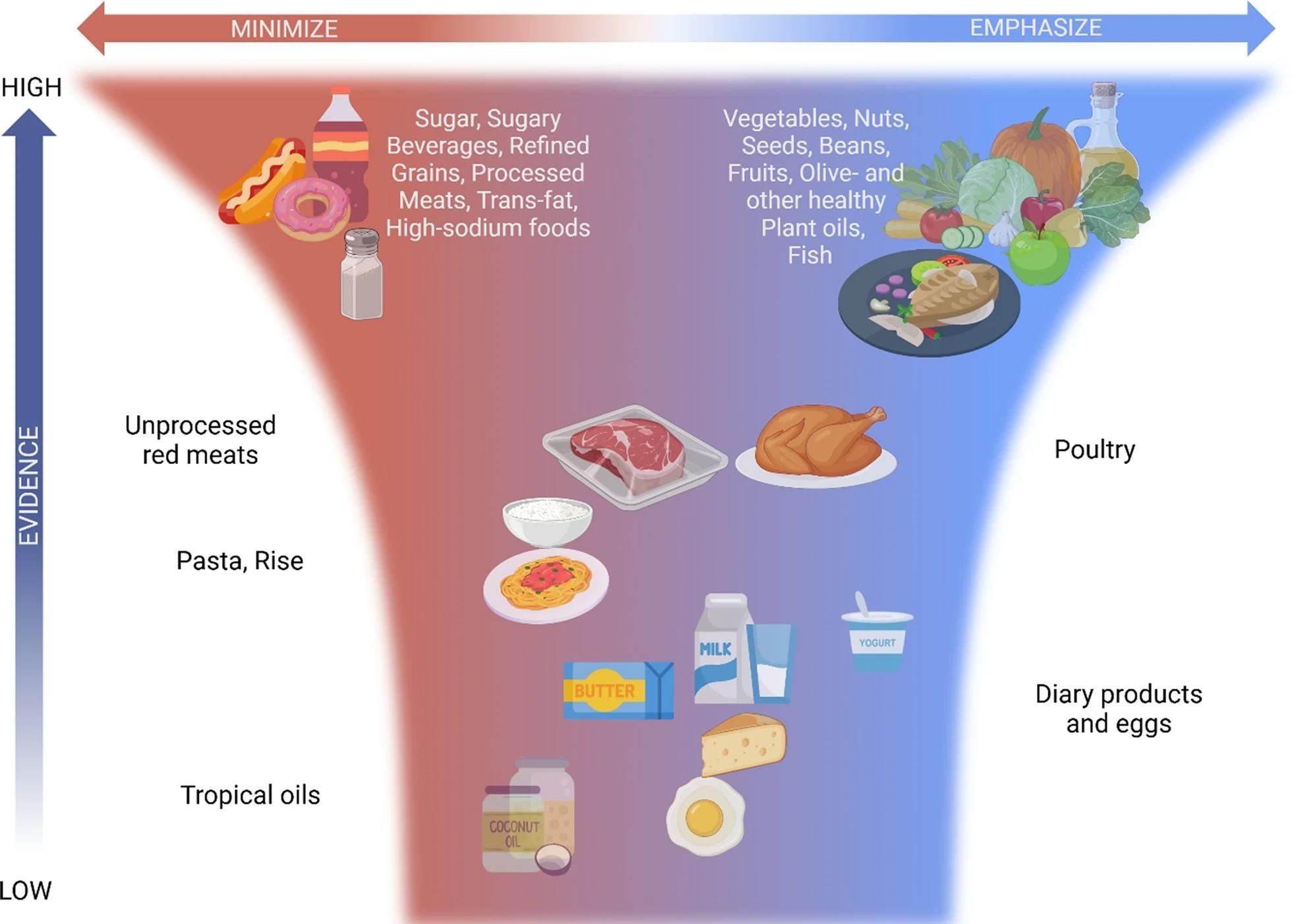 Central illustration. General dietary recommendations for cardiometabolic health. Visual representation of common foods and the level of general consensus regarding the strength of evidence (foods in the upper part have wide consensus), as well as the general recommendations (foods on the right should be emphasized in the diet)