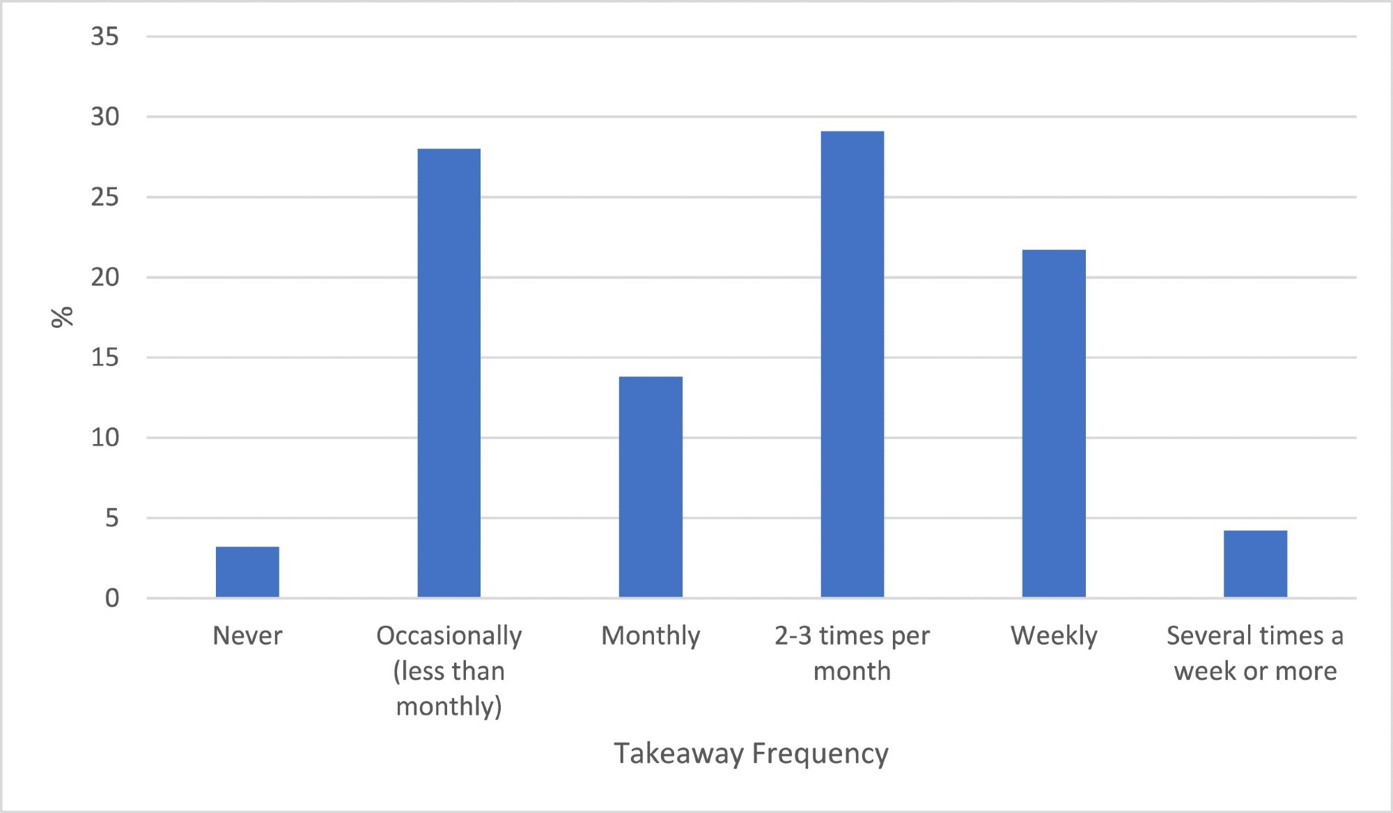 Takeaway food was consumed infrequently (less than once a week) by 74% and frequently (once a week or more) by 26%. Most frequent consumers had takeaway once a week (84%), while a few had it several times per week (16%).