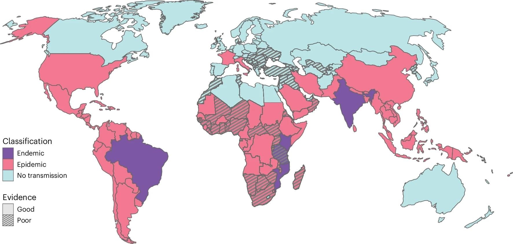 Study data was obtained via a literature review of Google, Google Scholar, PubMed, GIDEON, WHO/PAHO, and ProMED digital scientific repositories. Studies investigating countries and territories with population sizes of 200,000 or more (n = 180) were included in subsequent analyses. Where available, age-stratified seroprevalence data (n = 49), surveillance systems data (from National Ministry of Health websites), and mosquito vector maps (Aedes aegypti and Aedes albopictus) were extracted.