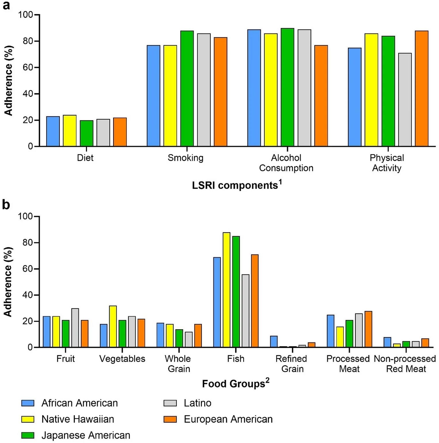 Adherence to LSRI components and dietary recommendations (%) by ethnic group. Adherence by ethnic group: (a) LSRI components and (b) dietary recommendations in percent (%) 1≥3 of 7 foods, no current smoking, ≤ 2 (men) or ≤ 1 (women) alcoholic drinks/day, ≥ 150 min/week physical activity 2Servings: ≥3 per day of fruits, ≥ 3 per day of vegetables, ≥ 3 per day of whole grains, ≥ 2 per week of fish, ≤ 1.5 per day of refined grains, ≤ 1 per week of processed meat, and ≤ 1.5 per week of non-processed red meat