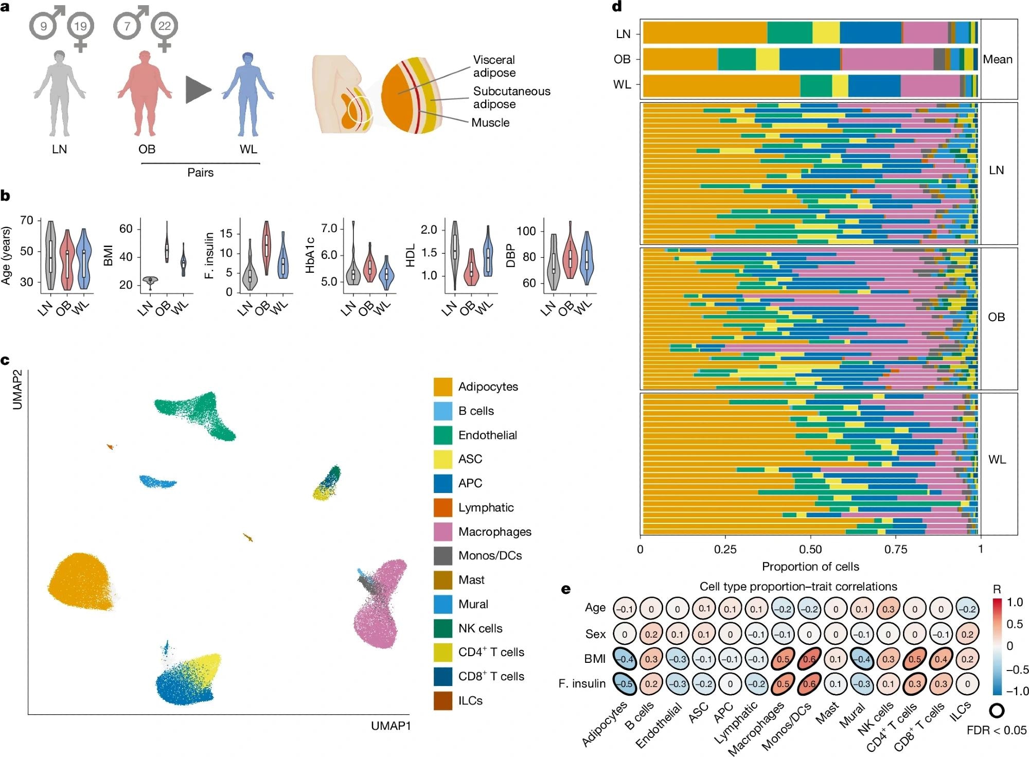 a, Graphical representation of the primary study cohort (left; single-nucleus analyses in n = 25 obese (OB) people before and after WL and n = 24 lean (LN) people, with spatial analyses in n = 4 people per group) and AT anatomical location (right). b, Clinical characteristics of the primary cohort (n = 24 LN and 25 paired OB–WL donors). Boxplot, median interquartile range minimum and maximum. BMI, body mass index (kg m–2); F insulin, fasting insulin (mIU L–1); HbA1c, haemoglobin A1c (%); HDL, high-density lipoprotein cholesterol (mM); DBP, diastolic blood pressure (mm Hg). c, Uniform manifold approximation and projection (UMAP) of 145,452 human AT cells (n = 74 samples of the primary cohort and n = 13 samples of the Emont published cohort11, single nucleus). ASC, adipocyte stem cells; APC, adipocyte progenitor cells; Mono, monocytes; DCs, dendritic cells; ILCs, innate lymphoid cells. d, Cell-type proportions (for the cell types in c) in the combined cohort, mean per group, and for each sample (single nucleus). e, Correlations between cell types and clinical traits (Pearson, LN and OB samples only, single nucleus). Illustration in a created using BioRender (Scott, W., https://BioRender.com/rtmnzaj; 2025).a, Graphical representation of the primary study cohort (left; single-nucleus analyses in n = 25 obese (OB) people before and after WL and n = 24 lean (LN) people, with spatial analyses in n = 4 people per group) and AT anatomical location (right). b, Clinical characteristics of the primary cohort (n = 24 LN and 25 paired OB–WL donors). Boxplot, median interquartile range minimum and maximum. BMI, body mass index (kg m–2); F insulin, fasting insulin (mIU L–1); HbA1c, haemoglobin A1c (%); HDL, high-density lipoprotein cholesterol (mM); DBP, diastolic blood pressure (mm Hg). c, Uniform manifold approximation and projection (UMAP) of 145,452 human AT cells (n = 74 samples of the primary cohort and n = 13 samples of the Emont published cohort11, single nucleus). ASC, adipocyte stem cells; APC, adipocyte progenitor cells; Mono, monocytes; DCs, dendritic cells; ILCs, innate lymphoid cells. d, Cell-type proportions (for the cell types in c) in the combined cohort, mean per group, and for each sample (single nucleus). e, Correlations between cell types and clinical traits (Pearson, LN and OB samples only, single nucleus). Illustration in a created using BioRender (Scott, W., https://BioRender.com/rtmnzaj; 2025).
