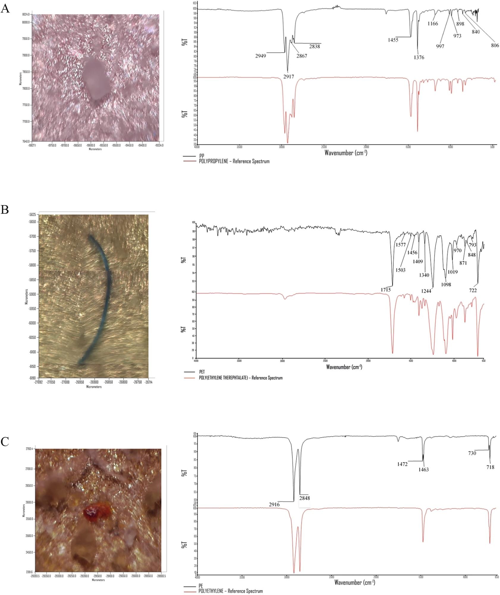 Images and Fourier-transformed infrared micro-spectroscopy in attenuated total reflectance mode analysis (μ-FTIR-ATR) spectra of three identified MP with different shapes and colors: A polypropylene, B poly(ethylene terephthalate), and C polyethylene (black line for MP spectra from dairy products, red line for MP spectra from reference libraries).Images and Fourier-transformed infrared micro-spectroscopy in attenuated total reflectance mode analysis (μ-FTIR-ATR) spectra of three identified MP with different shapes and colors: A polypropylene, B poly(ethylene terephthalate), and C polyethylene (black line for MP spectra from dairy products, red line for MP spectra from reference libraries).